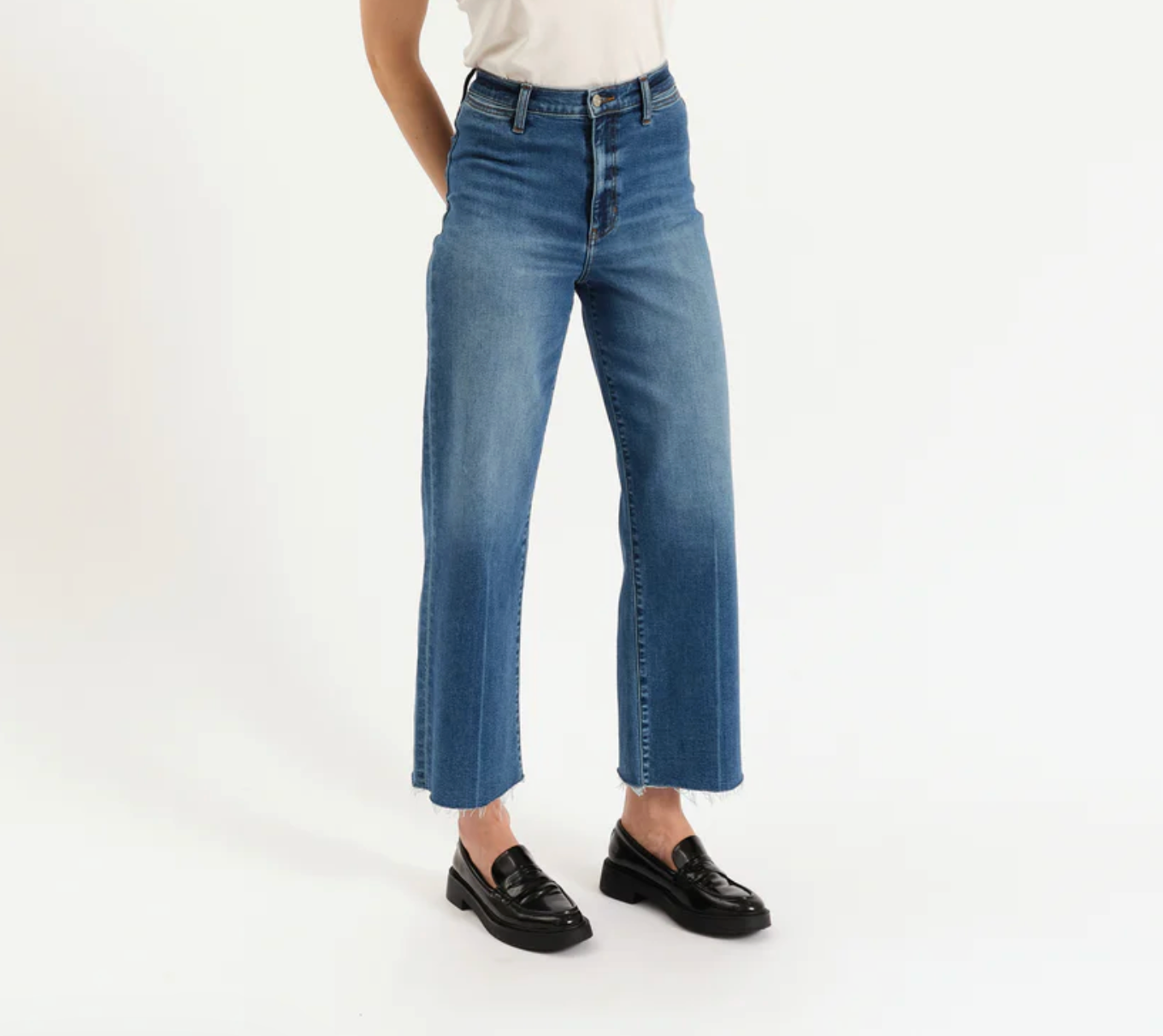 This style of wide-ankle jean features a striking dark indigo wash and a relaxed wide-leg silhouette that is designed to sculpt and shape the figure beautifully.