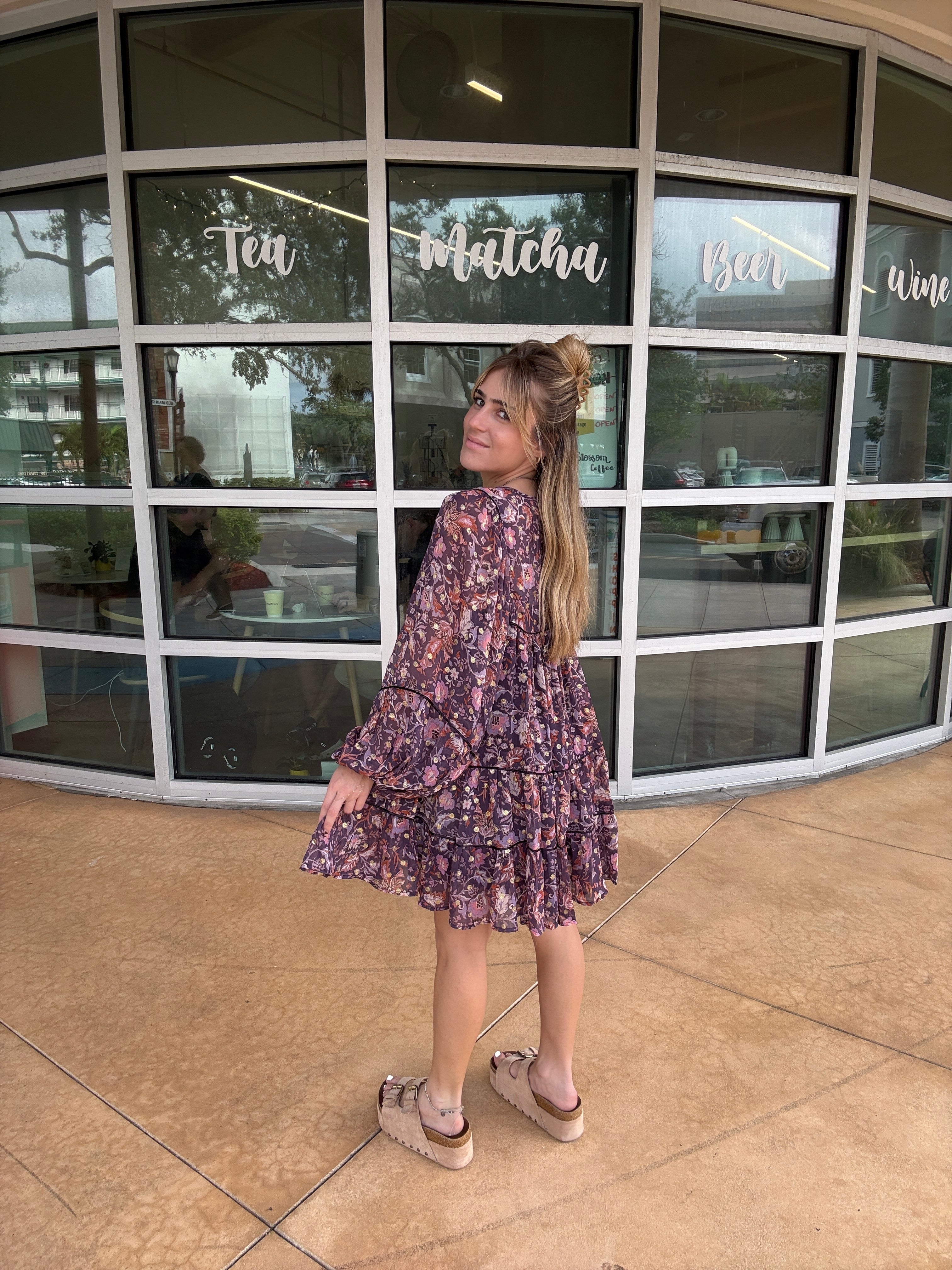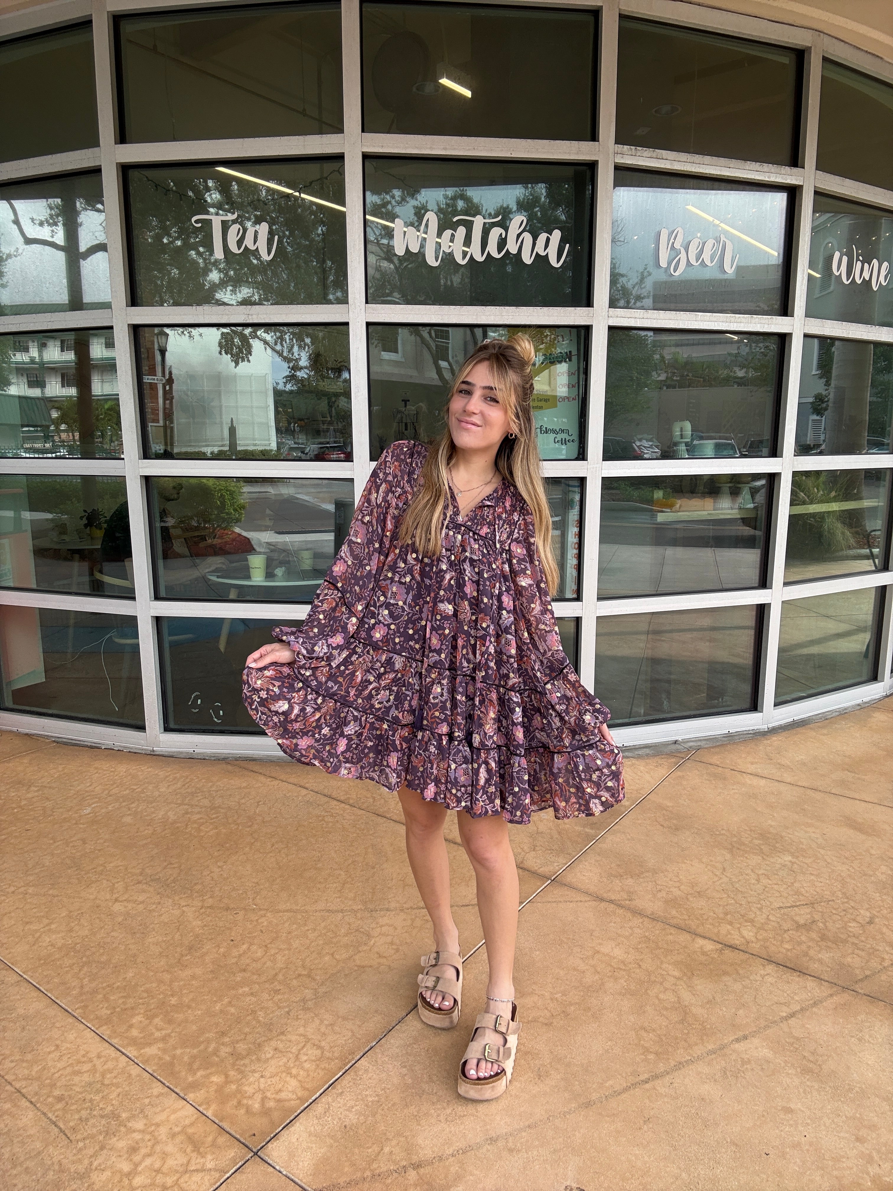 The tiered skirt and puffed sleeves create a flattering and movement-filled garment.