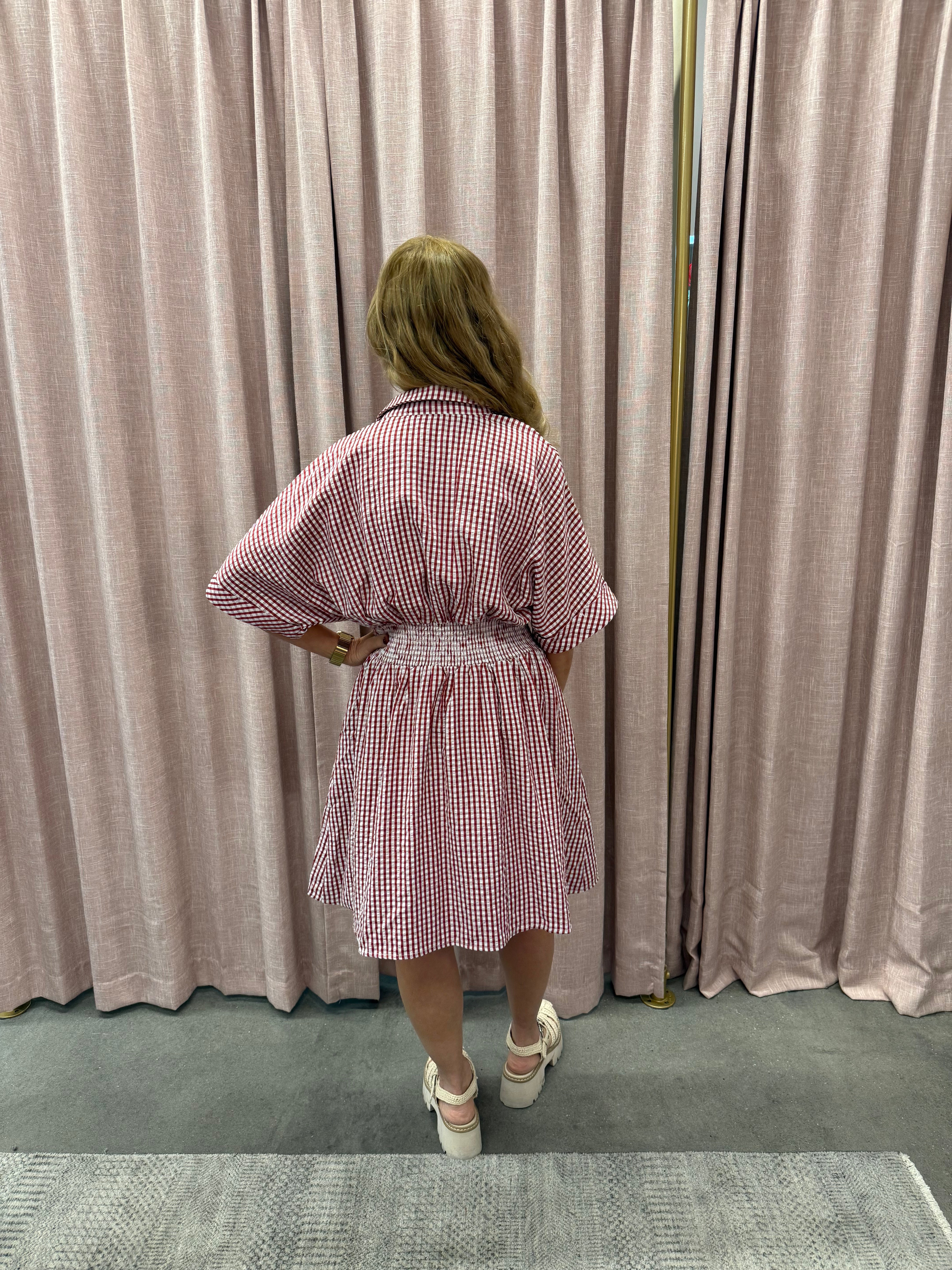 Presented in classic red and white gingham print, the dress is a versatile piece suitable for a range of occasions.