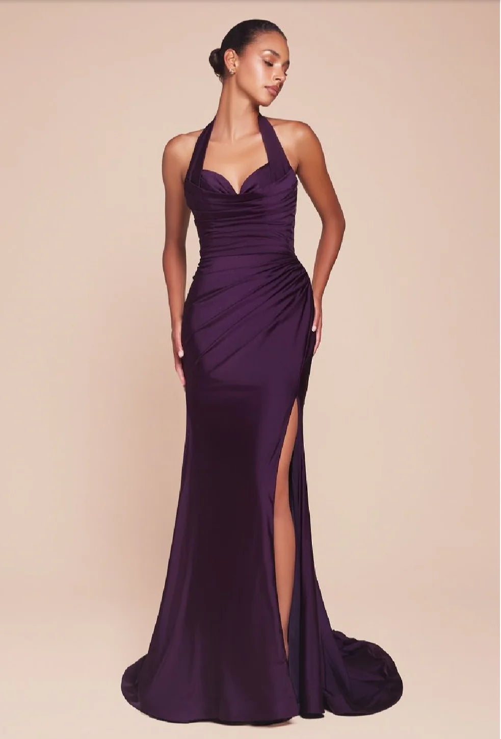 Elevate your elegance with this fitted stretch satin dress, featuring a halter sweetheart neckline and a gathered waistline. The design is enhanced by a sophisticated leg slit, providing a touch of allure and ease of movement. Perfect for bridesmaids or formal events, this dress ensures a flattering and graceful silhouette for any special occasion.