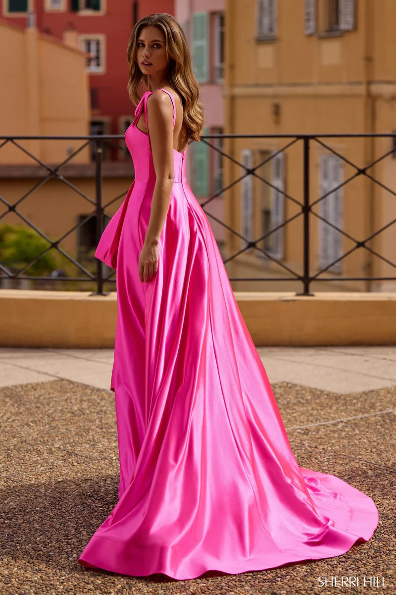 Make a fairytale statement in this breathtaking Sherri Hill gown, featuring a classic A-line silhouette, an elegant scoop neckline, and luxurious, voluminous satin in a vibrant hot pink hue.