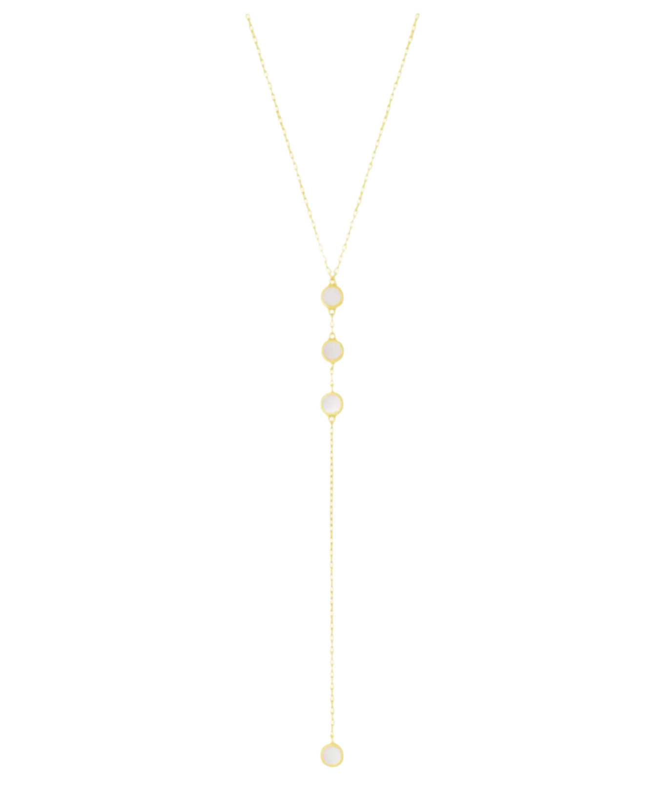 Elevate your jewelry collection with the Ren Lariat Necklace, a piece that embodies refined sophistication and timeless grace. Crafted from 925 sterling silver and luxuriously plated with 18k gold, this necklace radiates a warm, opulent glow that complements any ensemble. The delicate lariat design, a symbol of modern femininity, gracefully drapes along the neckline, creating a captivating focal point. The true allure of this necklace lies in its exquisite mother of pearl accents. Each piece of mother of pearl, carefully selected for its iridescent sheen, adds a touch of ethereal beauty and natural elegance. The interplay of the gold plating and the pearlescent accents creates a harmonious balance, resulting in a piece that is both luxurious and understated. The 40cm length, coupled with a 5cm extender chain, allows for versatile styling, enabling you to adjust the necklace to your preferred length and layer it with other pieces. Whether worn alone for a minimalist statement or paired with other necklaces for a layered look, the Ren Lariat Necklace adds a touch of refined glamour to any occasion. Perfect for both everyday wear and special events, this necklace is a testament to timeless design and exceptional craftsmanship.