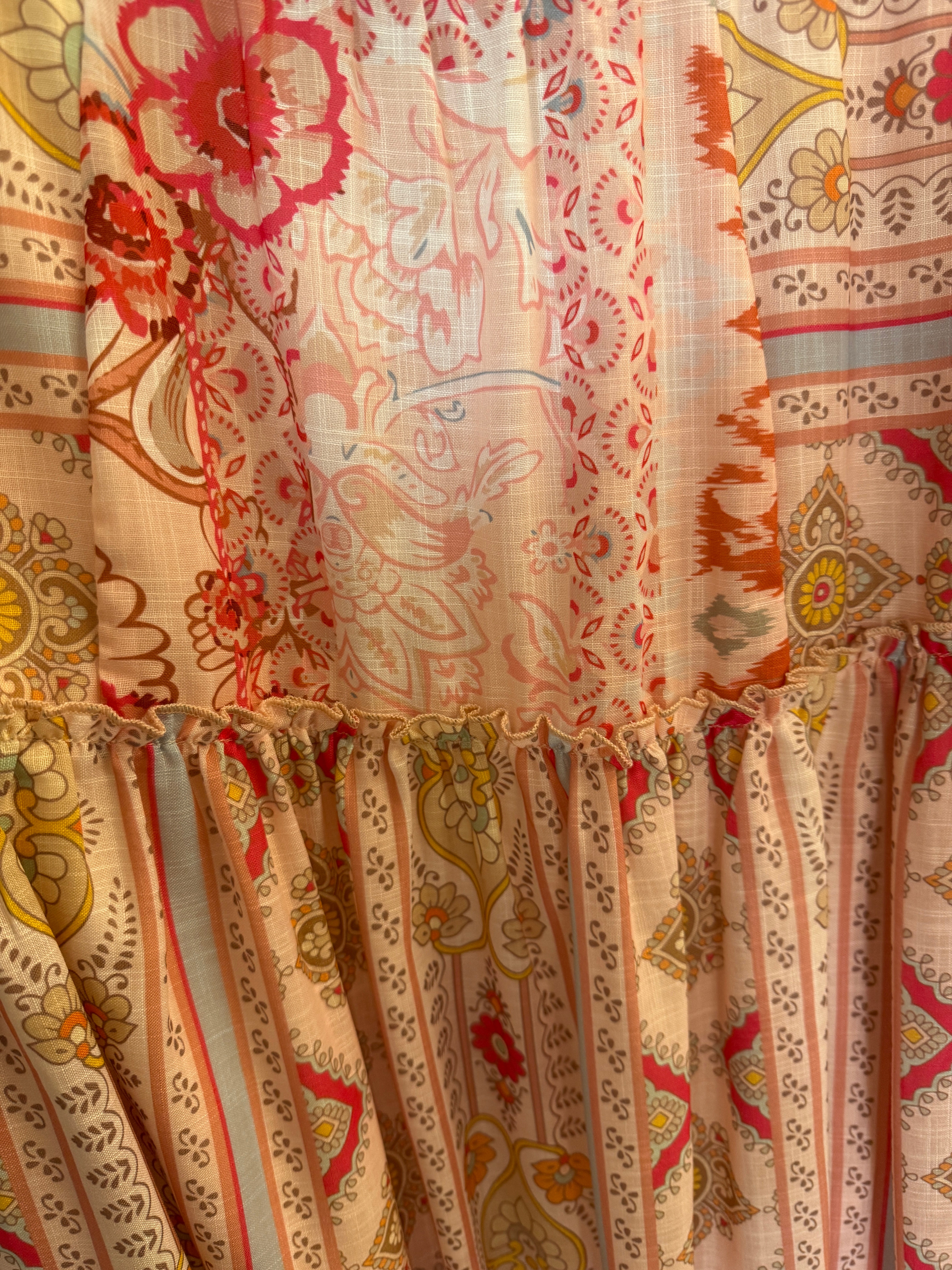 Features a vibrant geo floral patchwork pattern throughout the tiered skirt.