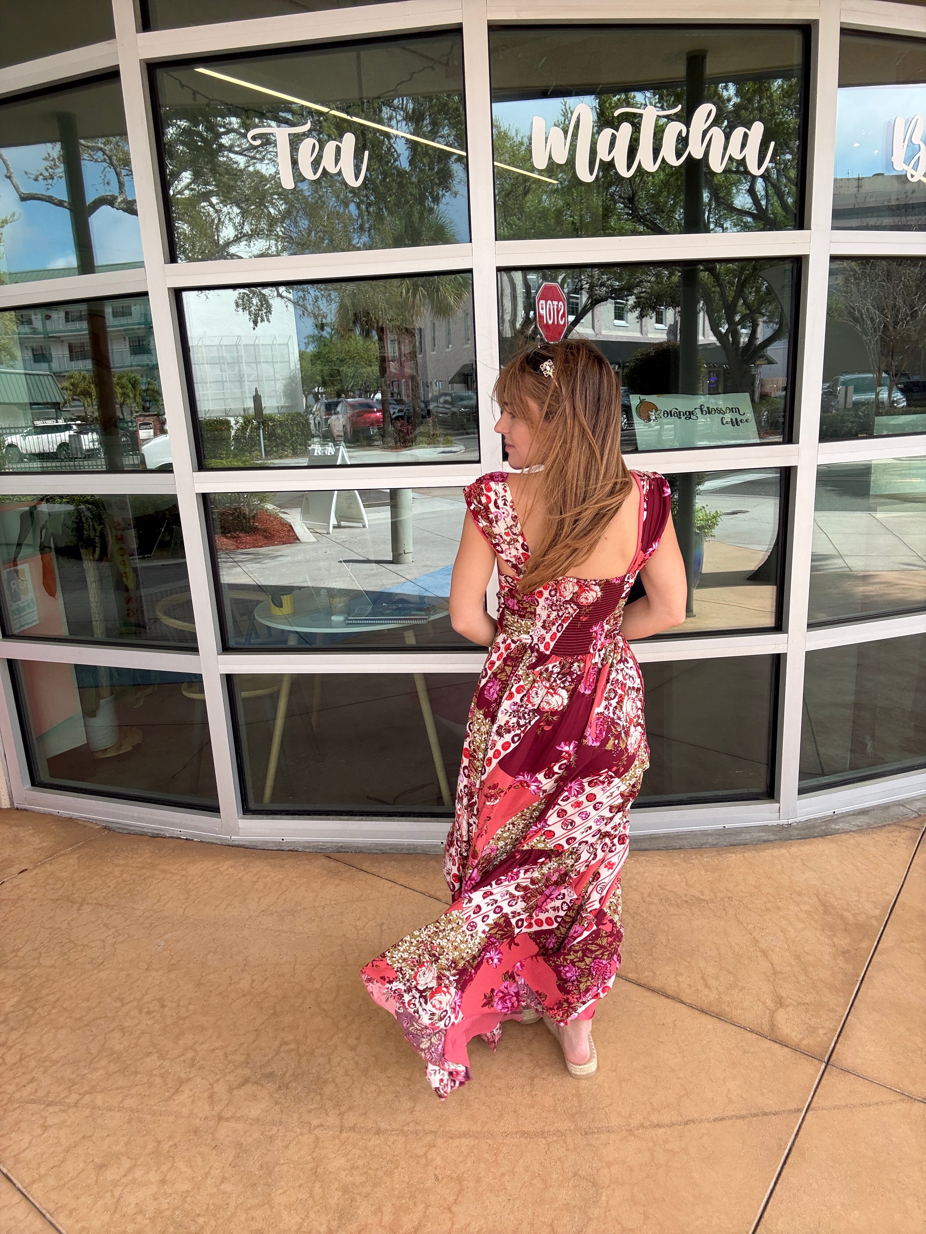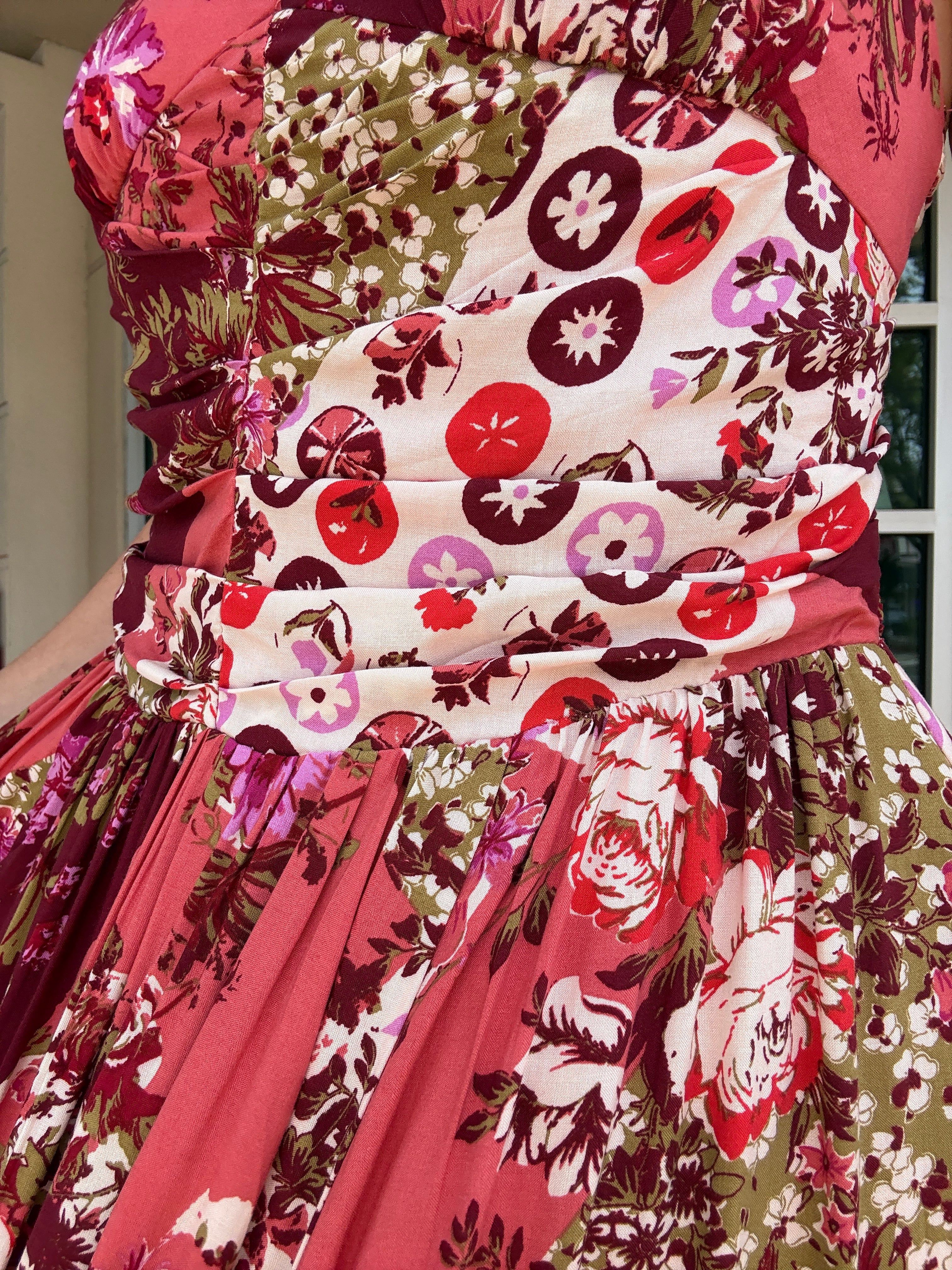 This floor-length maxi dress features a vibrant patchwork print that blends various patterns into a cohesive, bohemian aesthetic. Crafted from lightweight 100% viscose, the garment offers a fluid drape and a soft, breathable feel against the skin. The silhouette is defined by a structured corset-style bodice with elegant pleating, which transitions into a voluminous skirt finished with a dramatic wide ruffle at the hem. Designed for both style and comfort, it includes functional details and flexible sizing elements to ensure an easy, flattering fit for all-day wear.