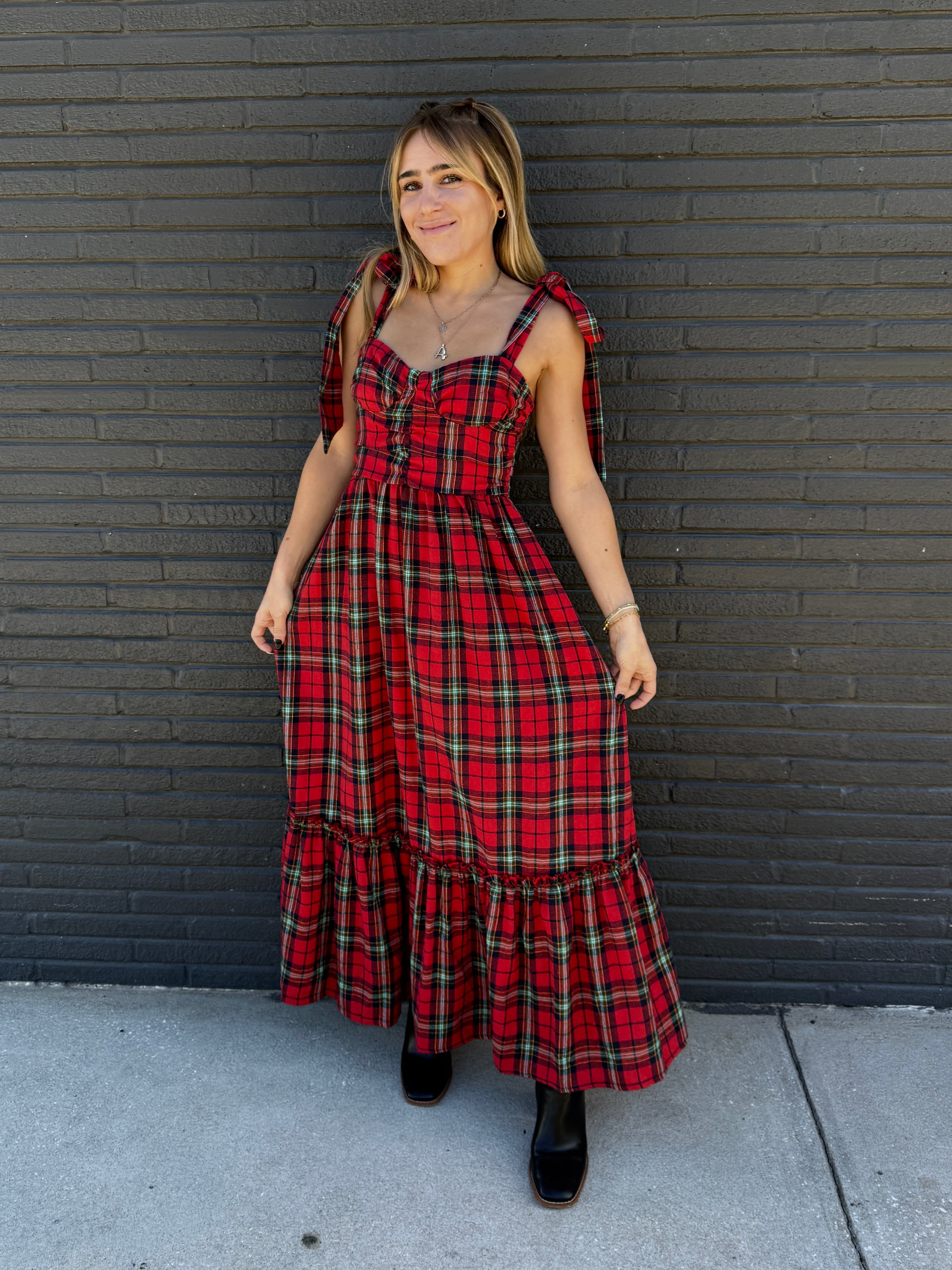 Midi Plaid Dress features a classic red and green plaid pattern, perfect for a festive or cozy look.