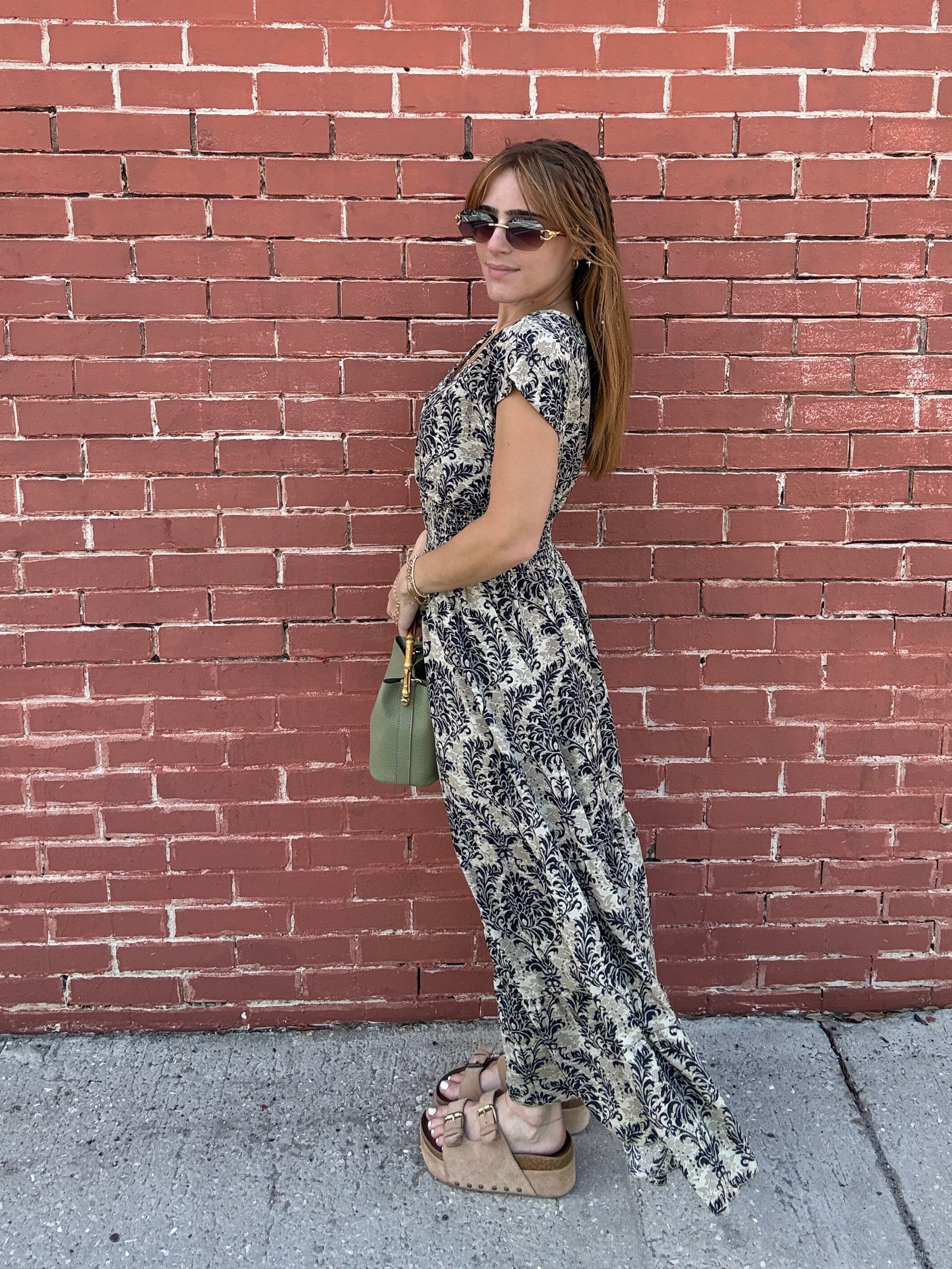 This maxi dress features a sophisticated damask-inspired print in a classic color palette against a neutral background.