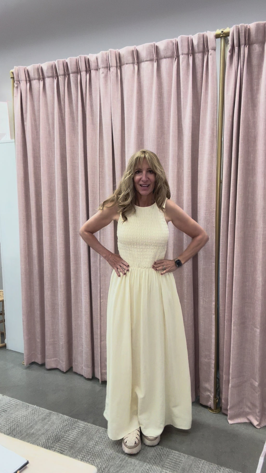 The Juniper Dress is thoughtfully designed with a flattering elastic bodice that provides a comfortable, secure fit, flowing beautifully into a full yet lightweight skirt. The sleeveless, crew neck silhouette offers a clean, modern look, while the midi-to-maxi length provides a sophisticated sweep that works for everything from backyard brunches to sunset dinners. Its incredible day-to-night versatility ensures you'll reach for it time and time again