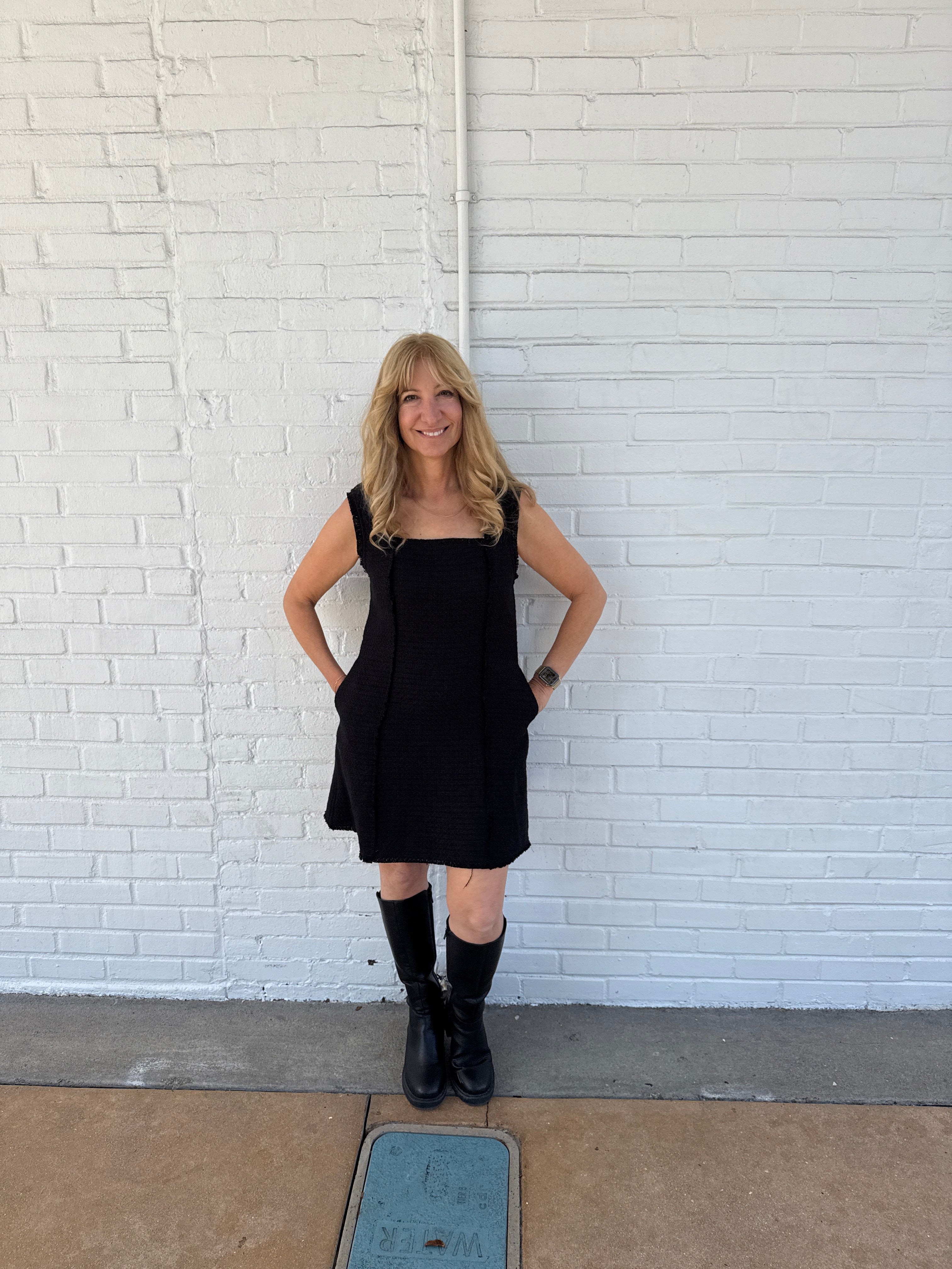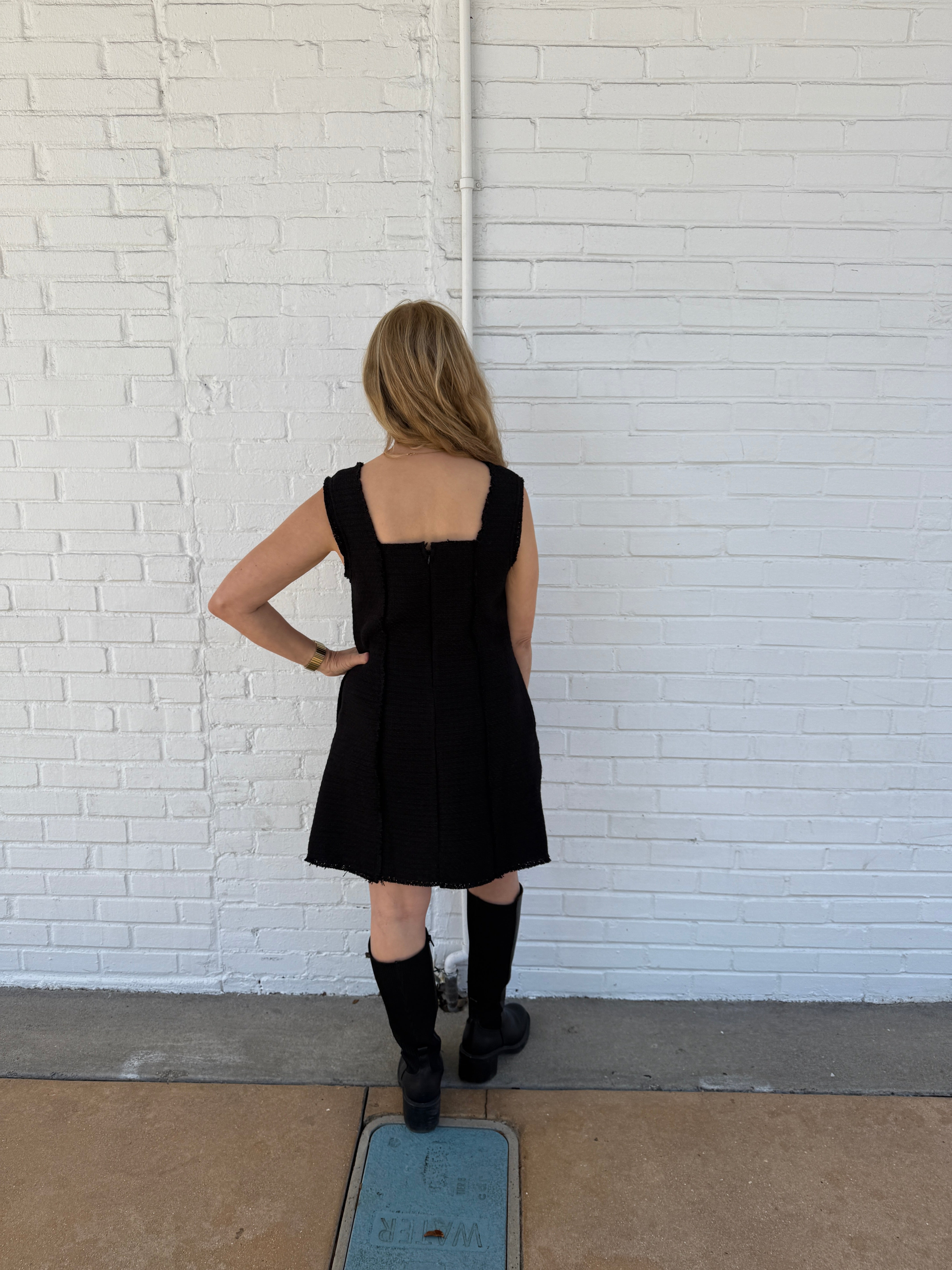 The tweed fabric and tailored design give this mini dress a polished, refined aesthetic.