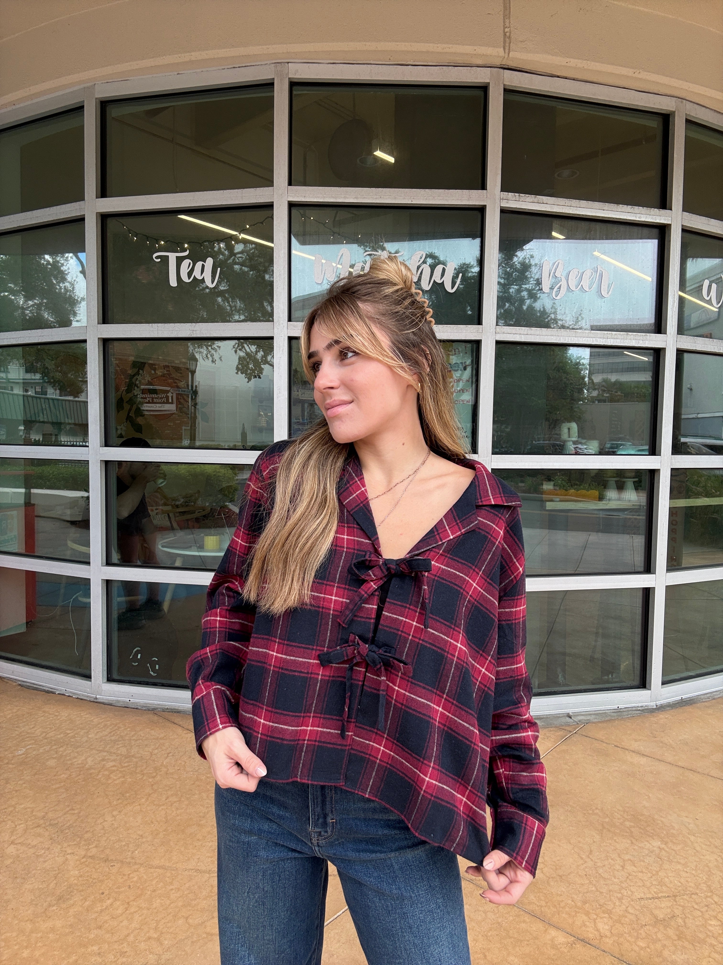 This shirt features a classic red and navy plaid pattern, offering a timeless and versatile look.