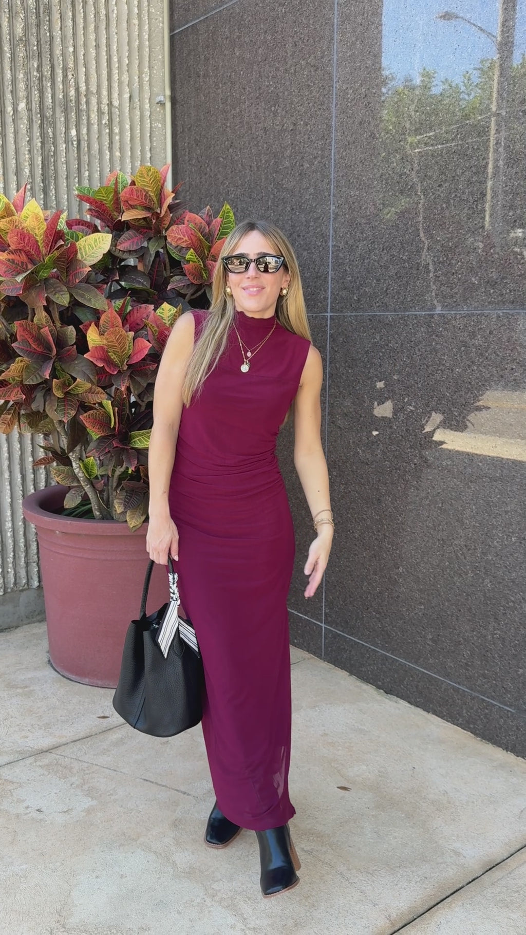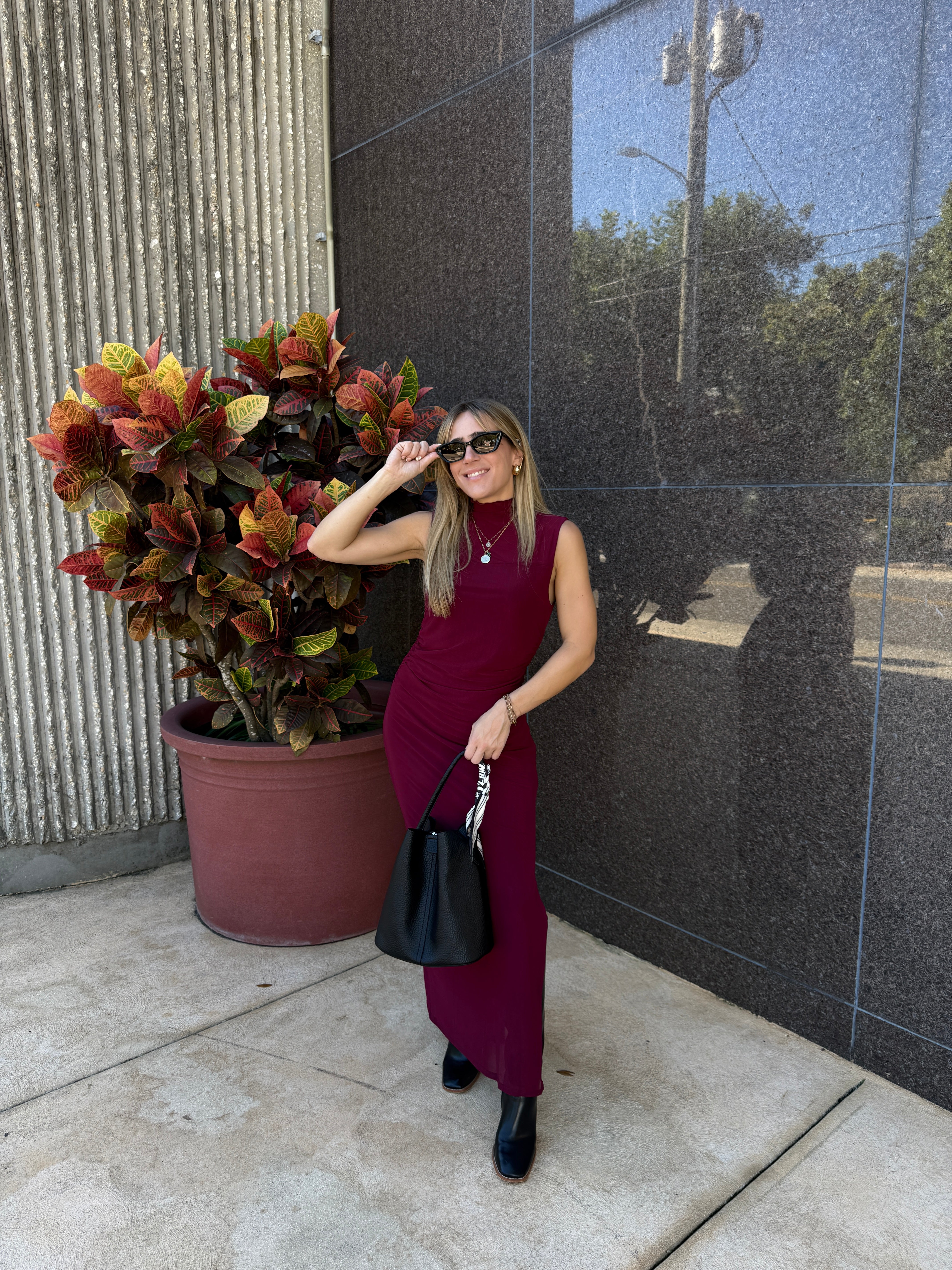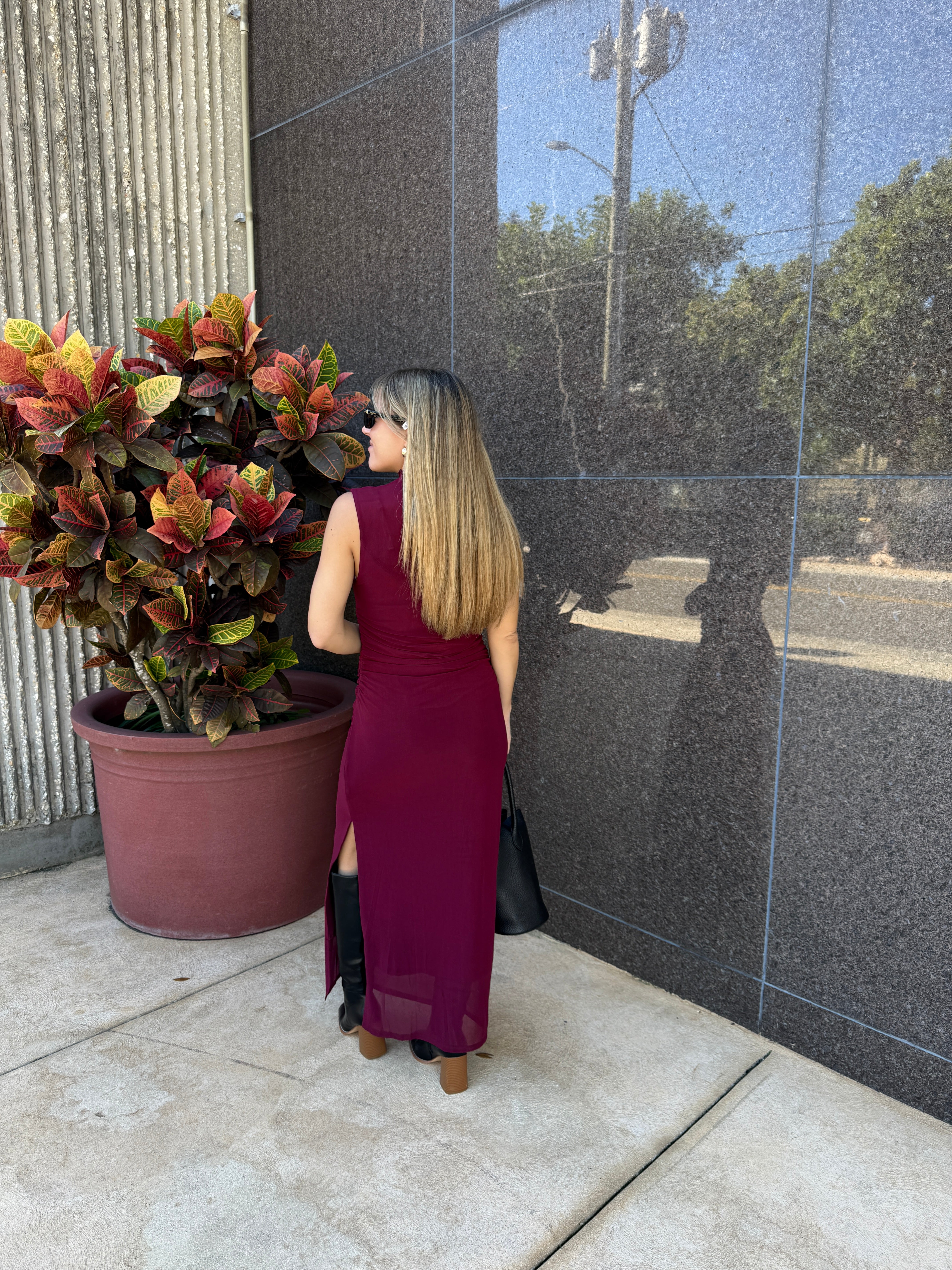 Mock Neck Ruched Mesh Dress Merlot offers a sleek and modern silhouette in a deep burgundy hue.