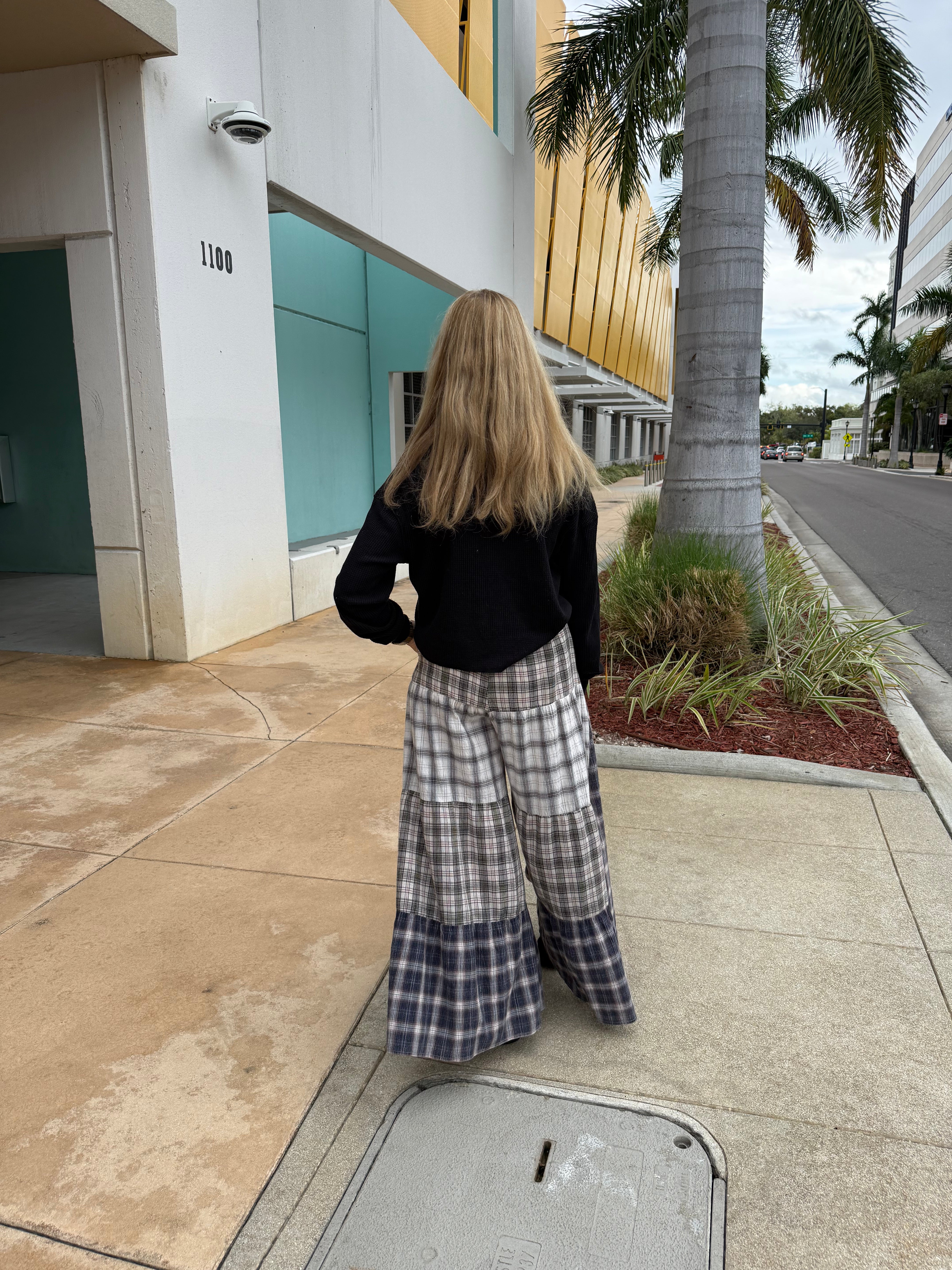 This playful statement piece merges contrasting textures and patterns into a comfortable, easy-to-wear tiered pant silhouette.