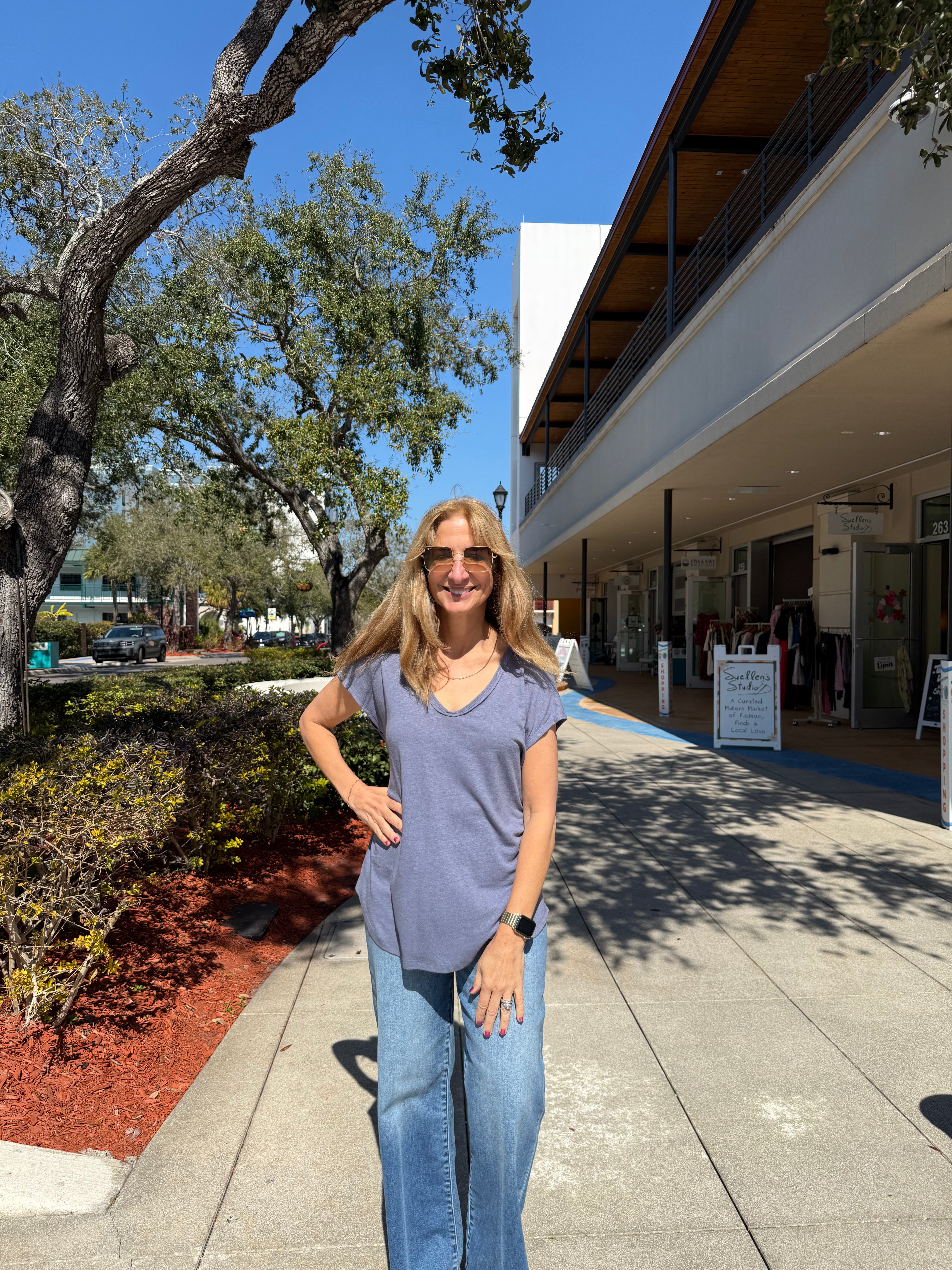 Back Raw Edge V-Neck Linen Tee – SLATE BLUE – Pink & Navy Boutique