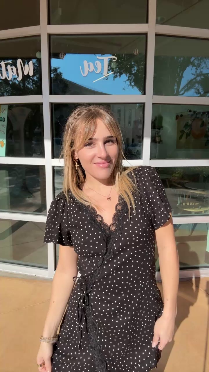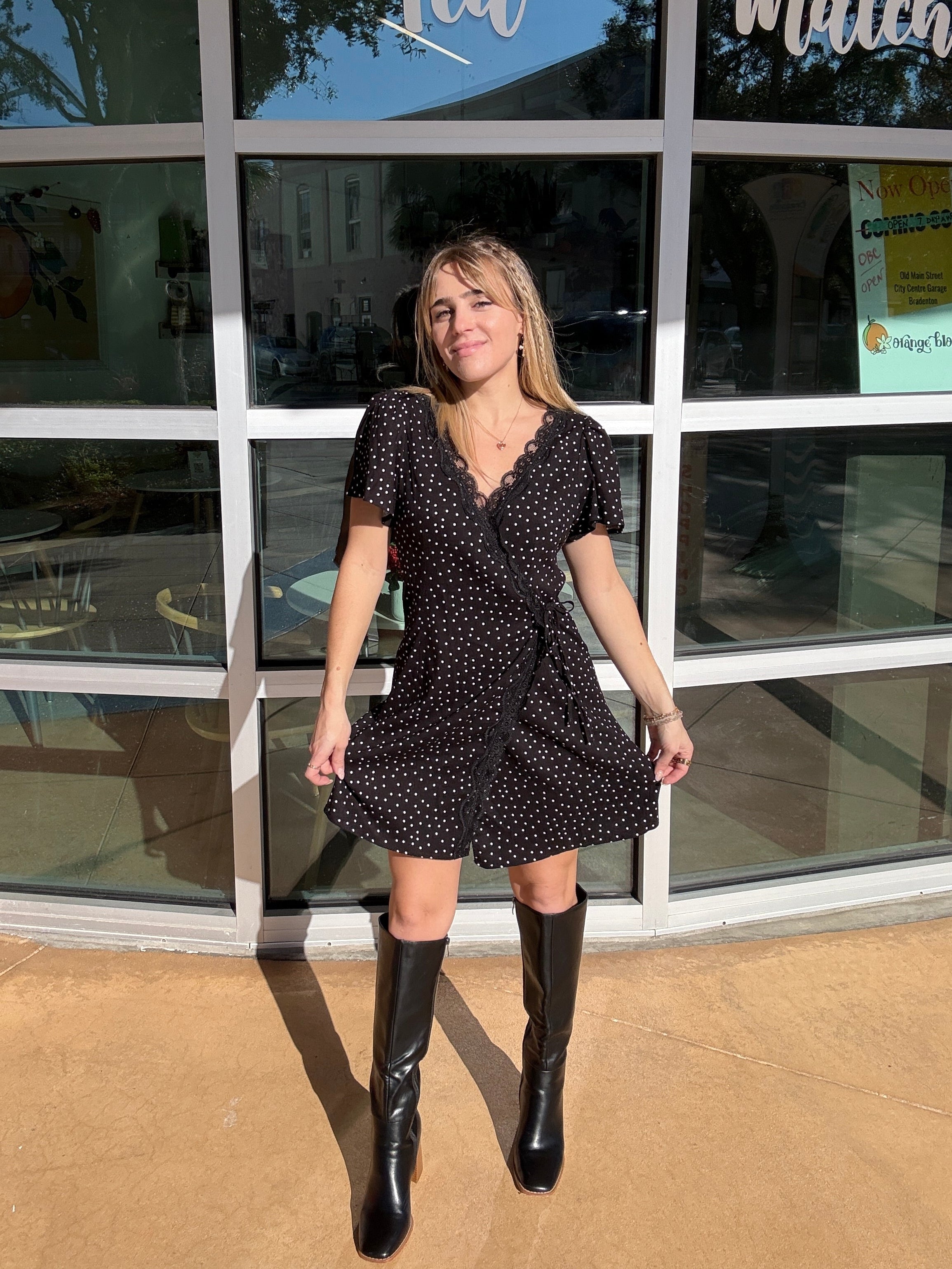 This playful mini dress features a classic white polka dot pattern set against a black background, perfect for a chic and feminine look.