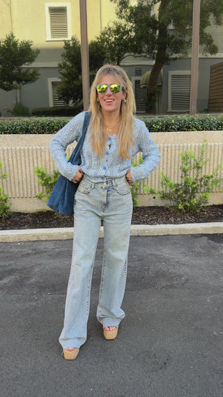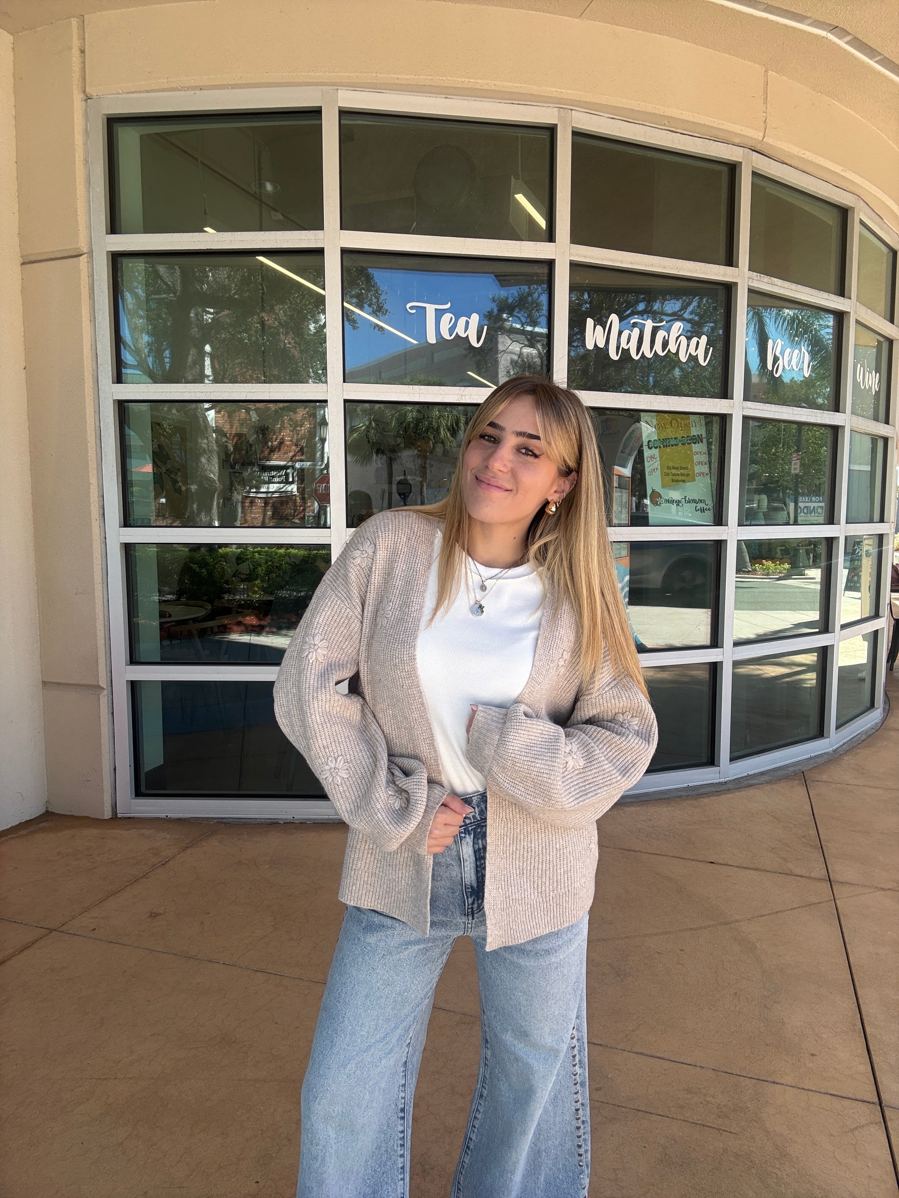 Floral Appliques Open Front Sweater Cardigan in Oatmeal is a comfortable and stylish wool-blend cardigan in a warm oatmeal cream color.