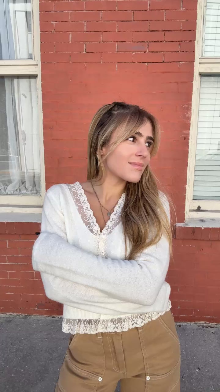 Lace Cardigan is a charming cropped cardigan featureing a feminine V-neckline and a classic button-front closure for easy wearing and styling.