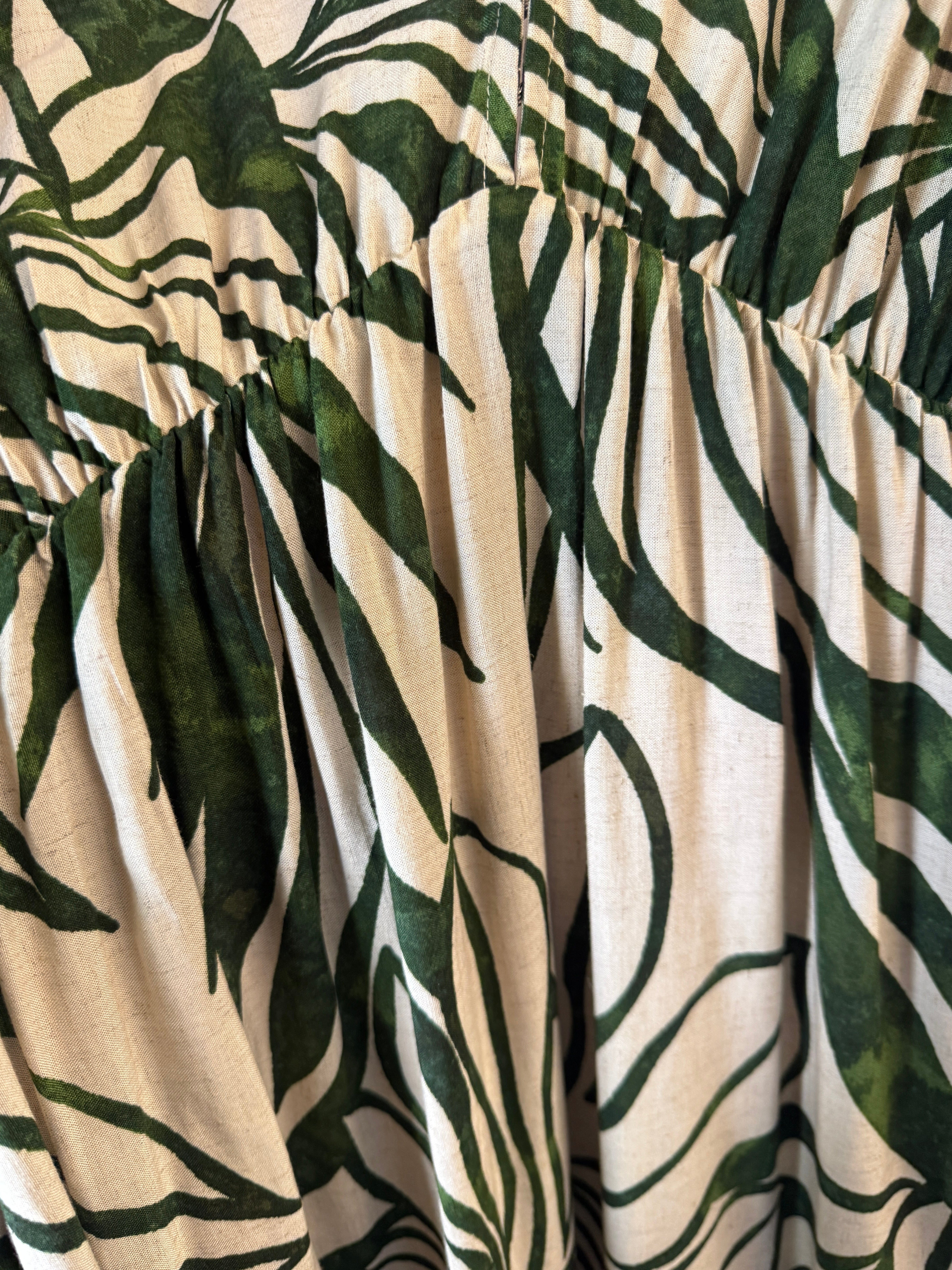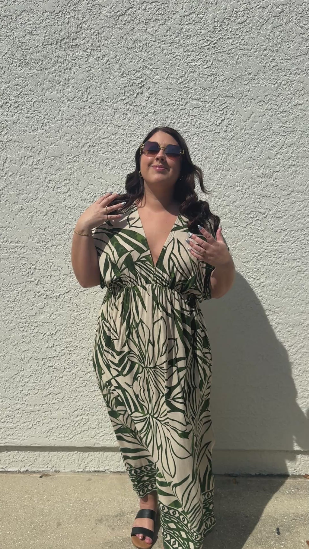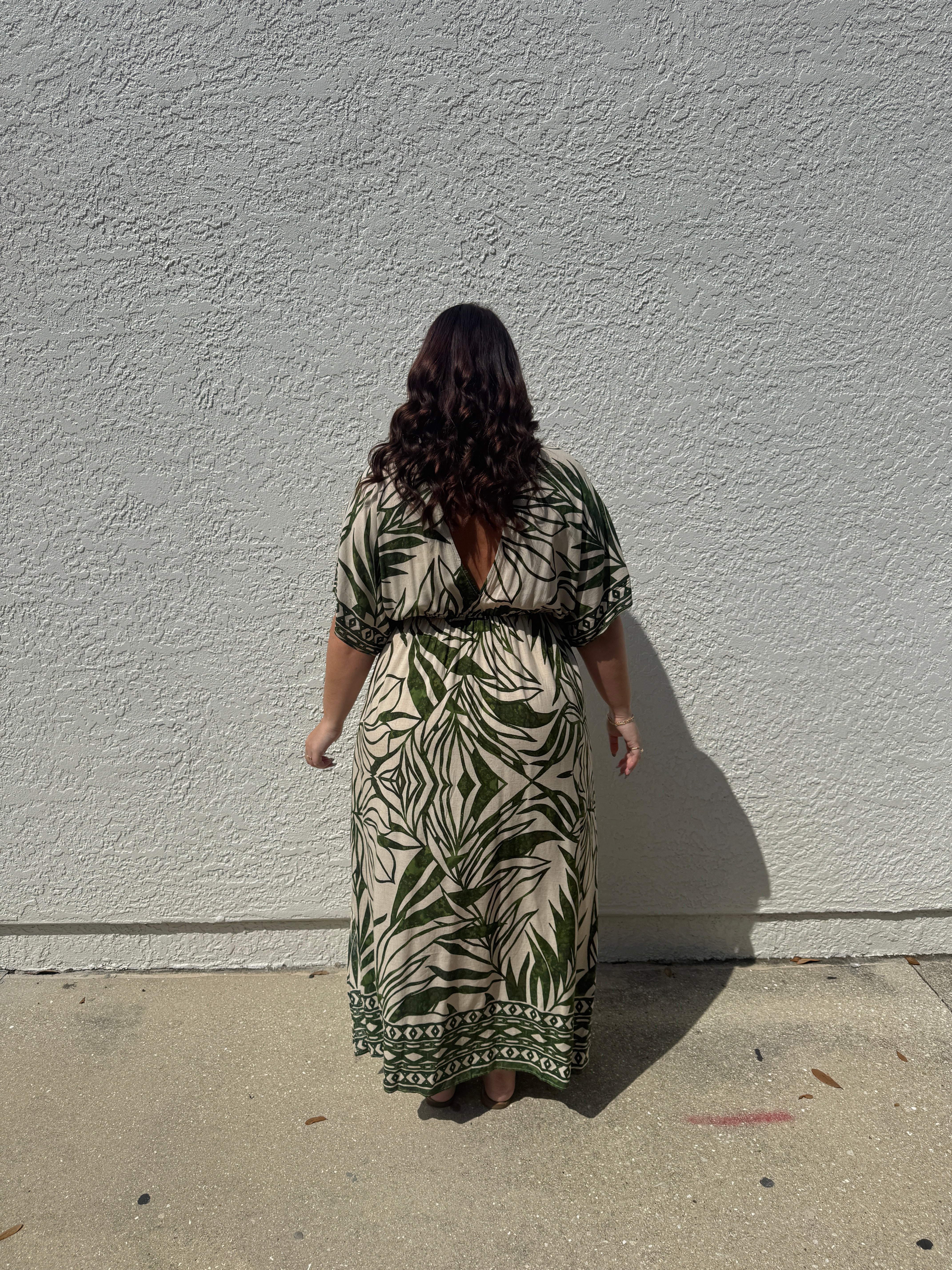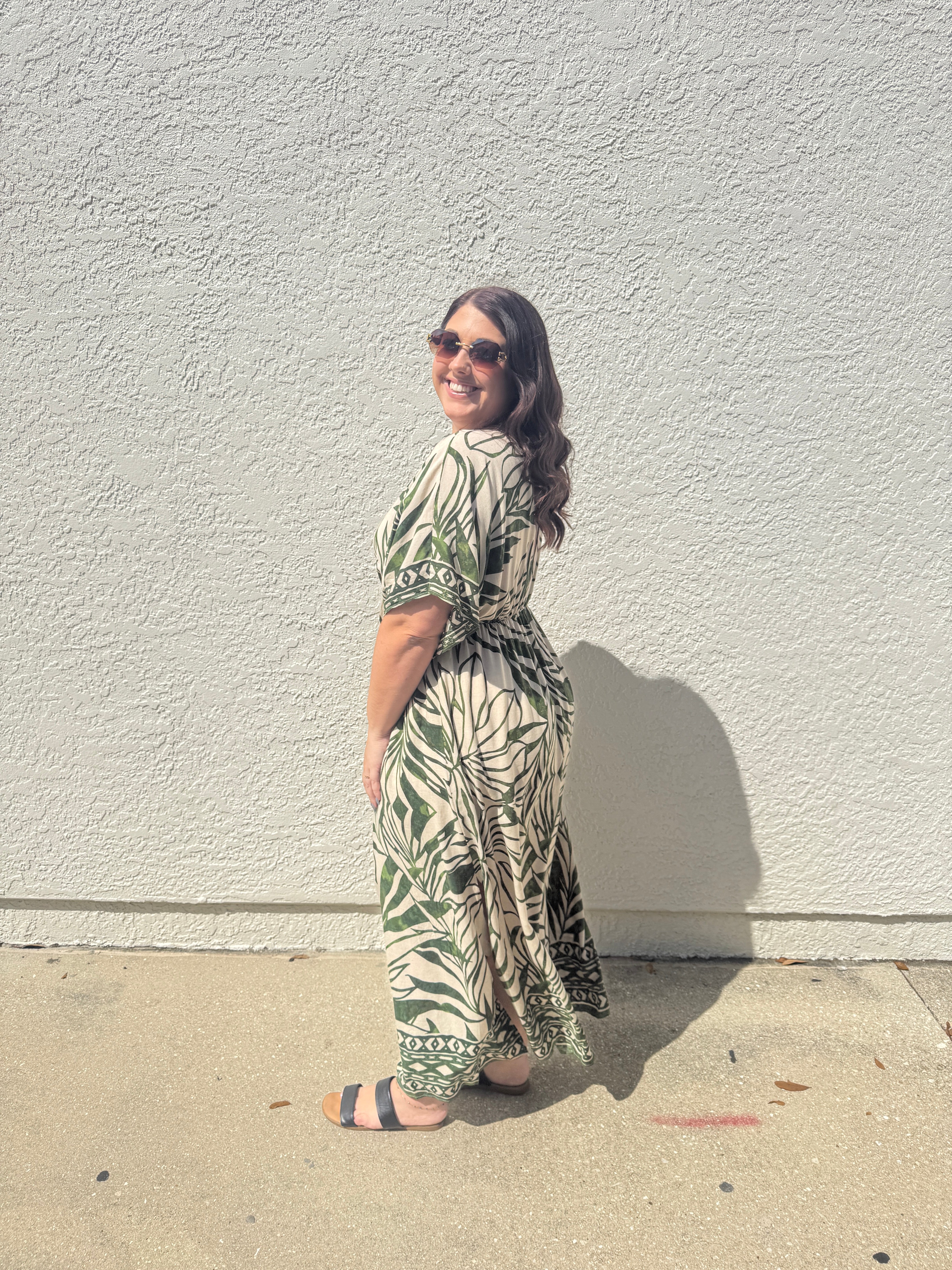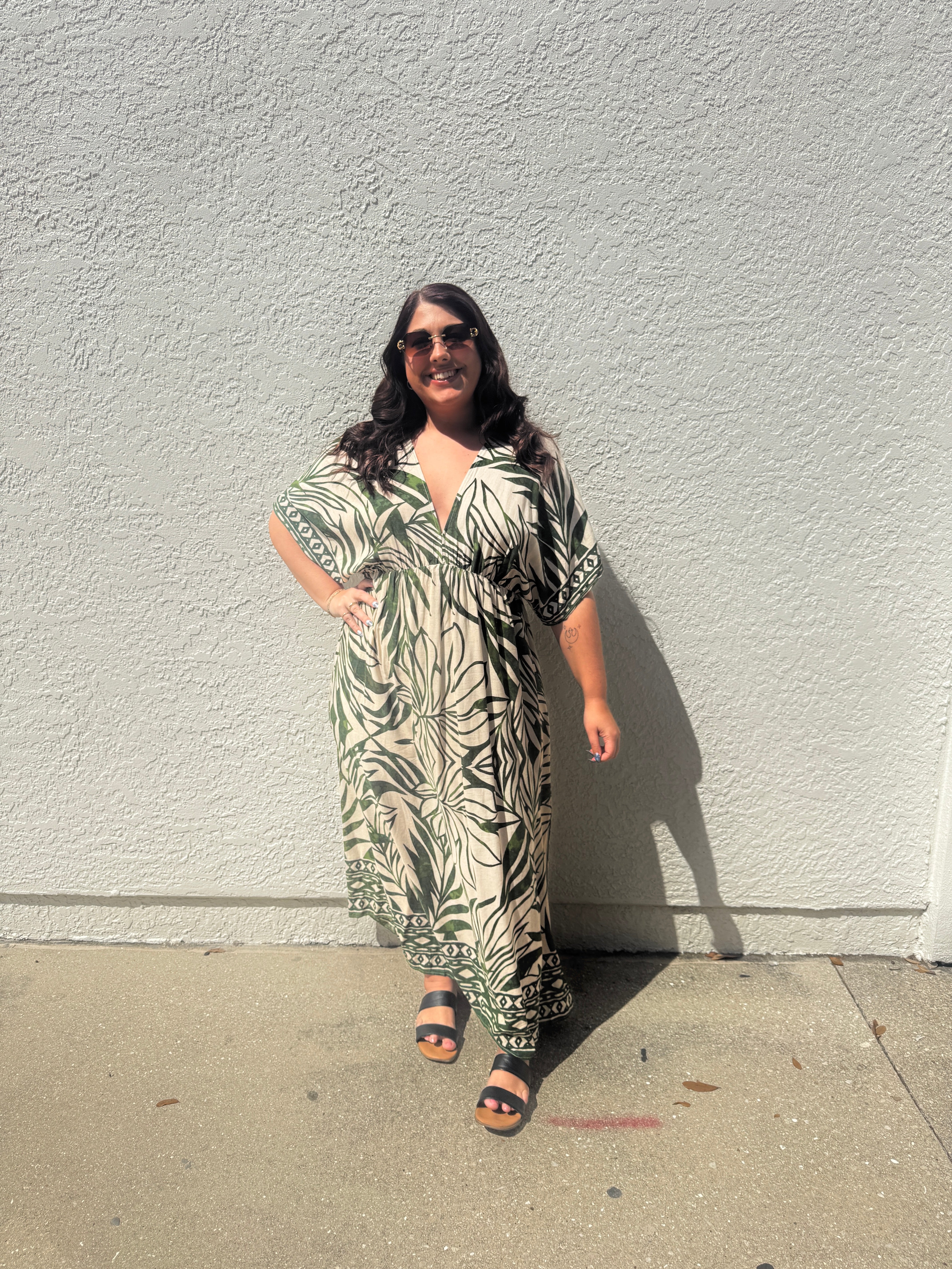 The Take Me Away Double Plunge Maxi Dress, Beach Cover Up, Caftan is a quintessential resort piece designed for high-impact style with minimal effort. Its vibrant green tropical border print set against a crisp white background makes it an ideal choice for beach clubs, garden parties, or sunset dinners.