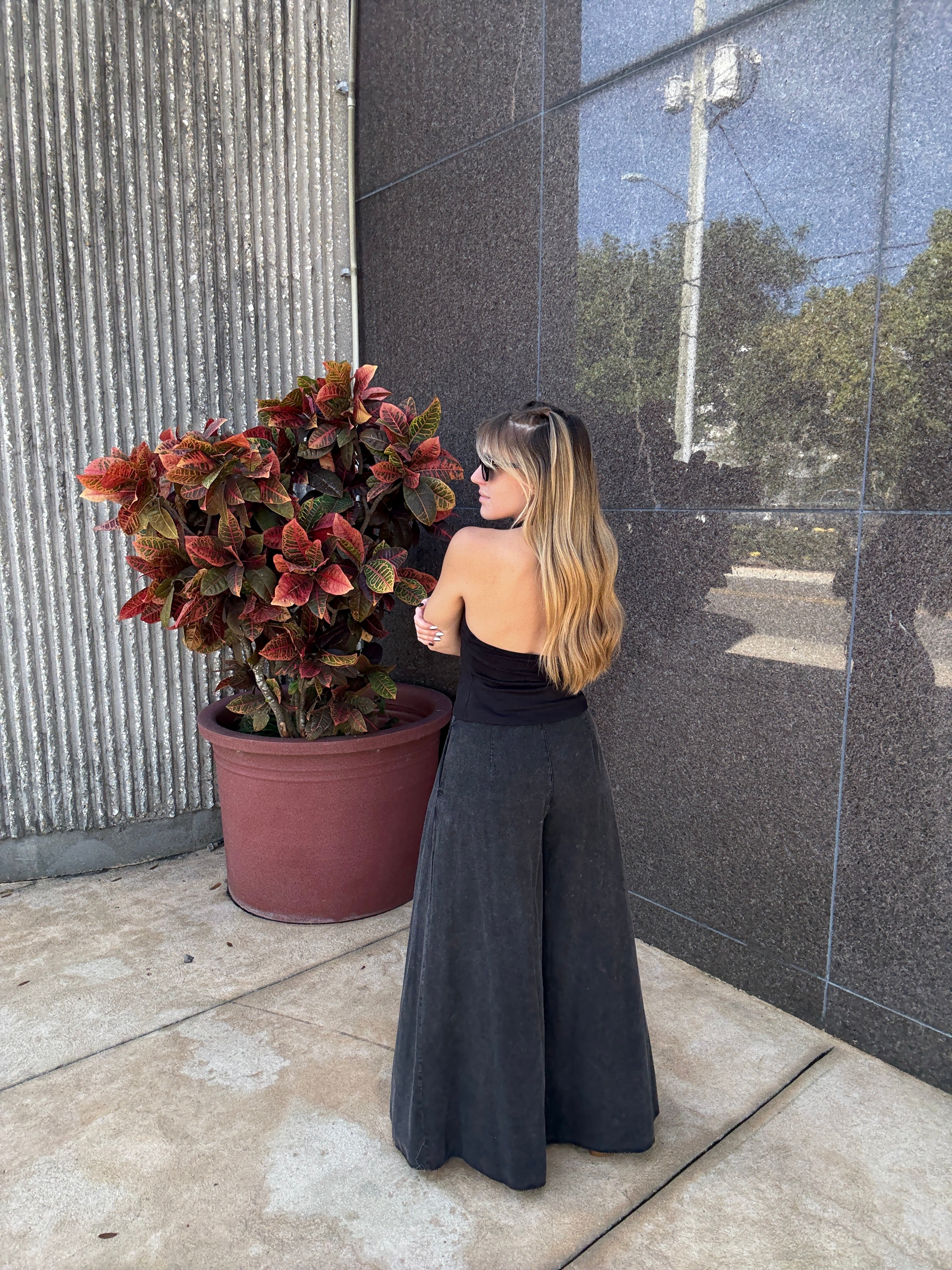 Pintuck Wide Leg Pant Washed Black feature sharp pintuck detailing down the front, creating an elongated and tailored look.