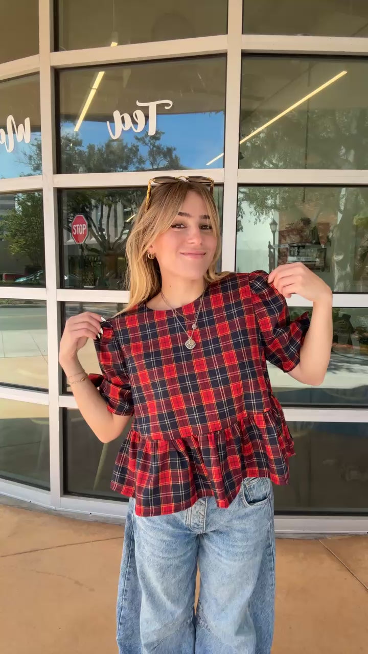 Plaid Short Sleeve Top is a stylish short-sleeve top features a classic red and navy plaid pattern, offering a timeless and versatile look.