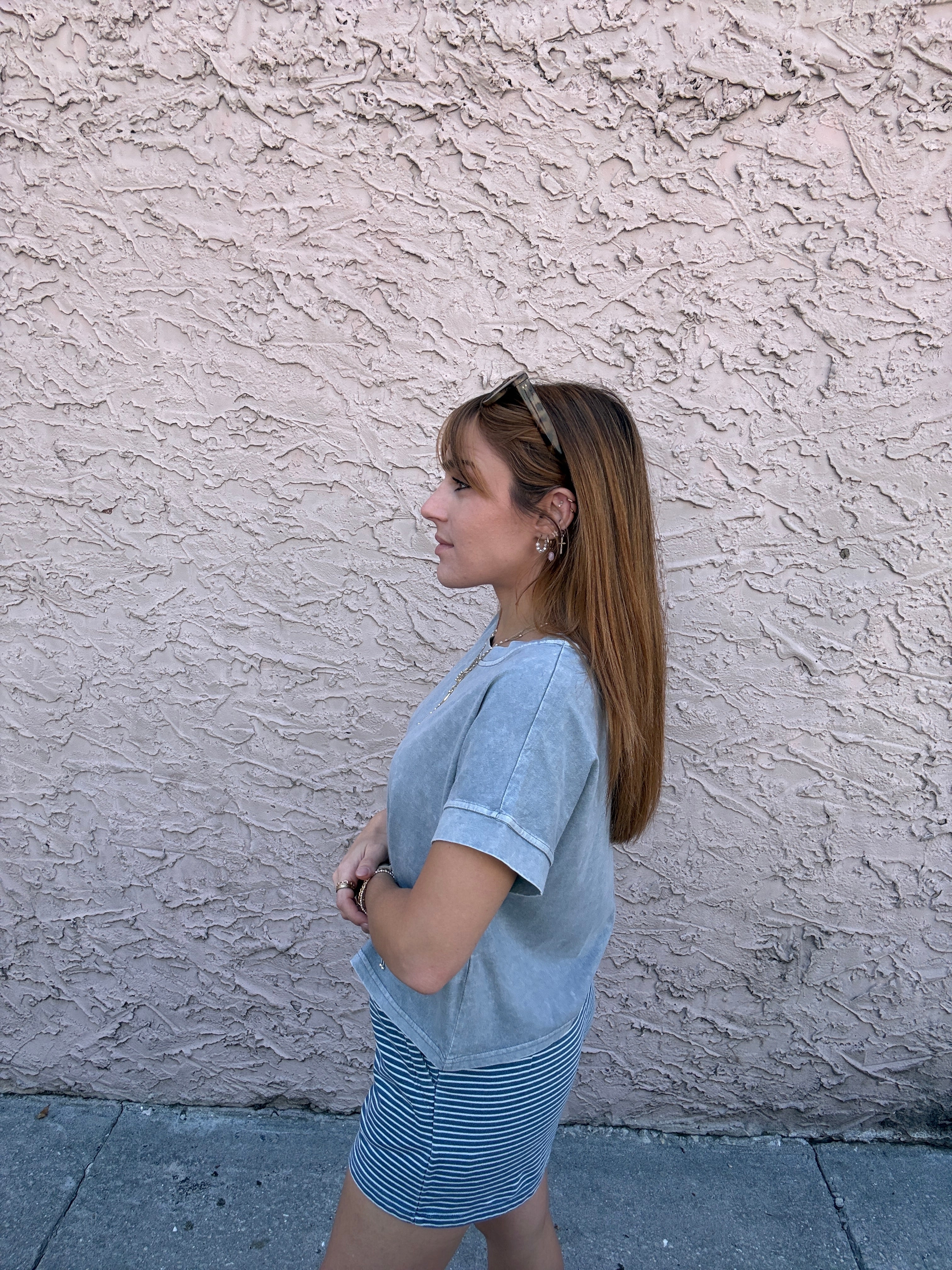 Features a classic washed stripe pattern with unique tonal variations throughout the knit fabric
