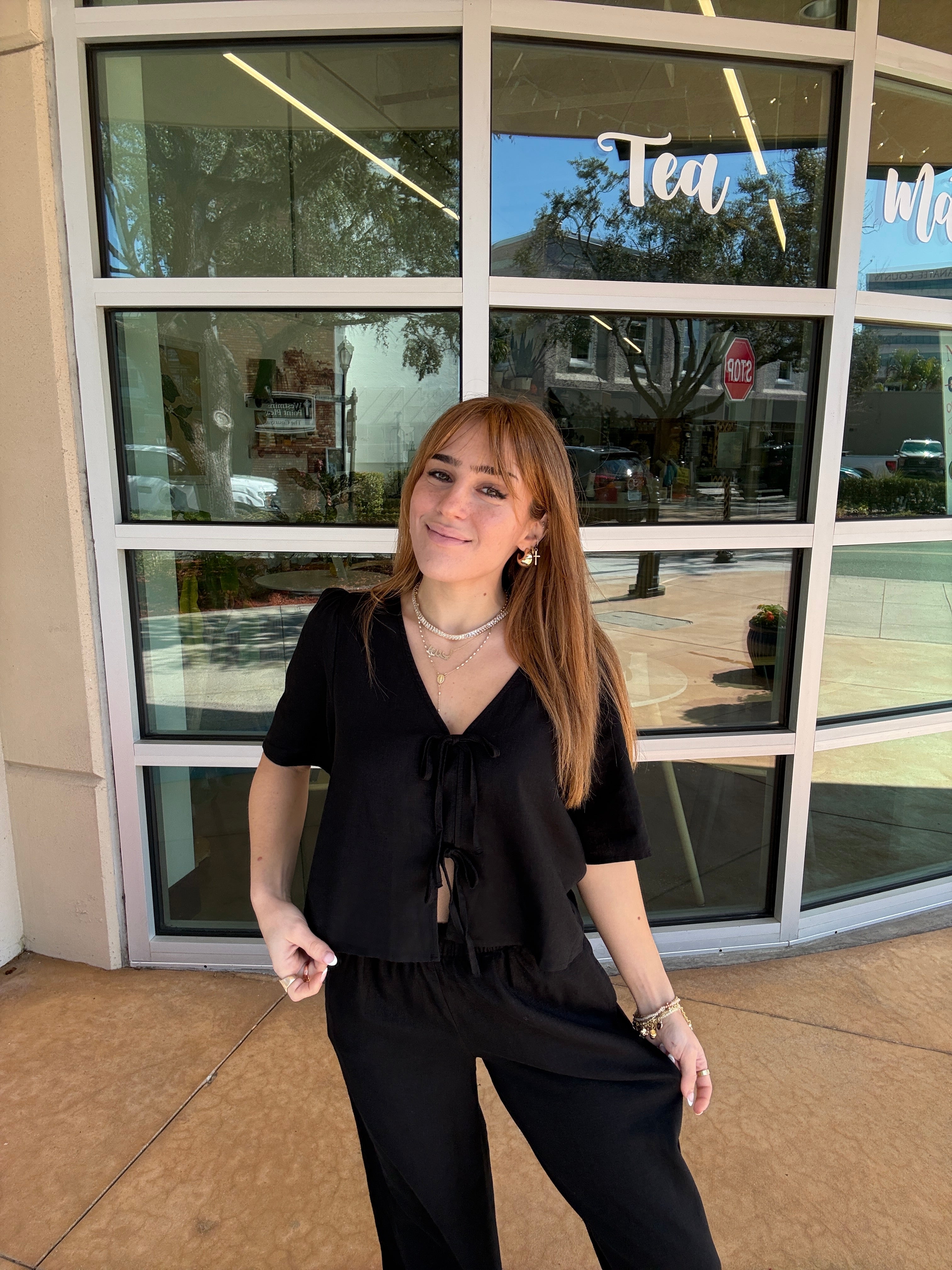 The silhouette features a flattering V-neckline and a charming tie-front design, uniquely finished with a modesty placket to provide effortless coverage without sacrificing style. Its lightweight, breathable fabric and relaxed fit make it the perfect companion for high-waisted denim or your favorite linen pants. Whether you’re dressing it up for brunch or keeping it casual for a seaside stroll, this short-sleeve crop is an instant classic.