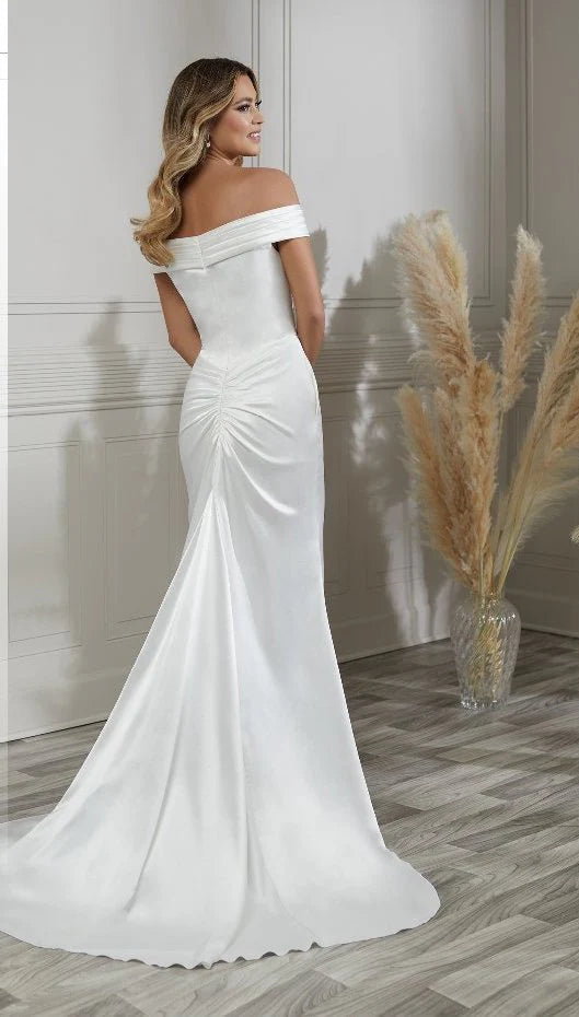 This elegant Christina Wu gown offers a timeless bridal or formal aesthetic with its luxurious ivory satin, classic off-the-shoulder neckline, and figure-flattering mermaid silhouette.