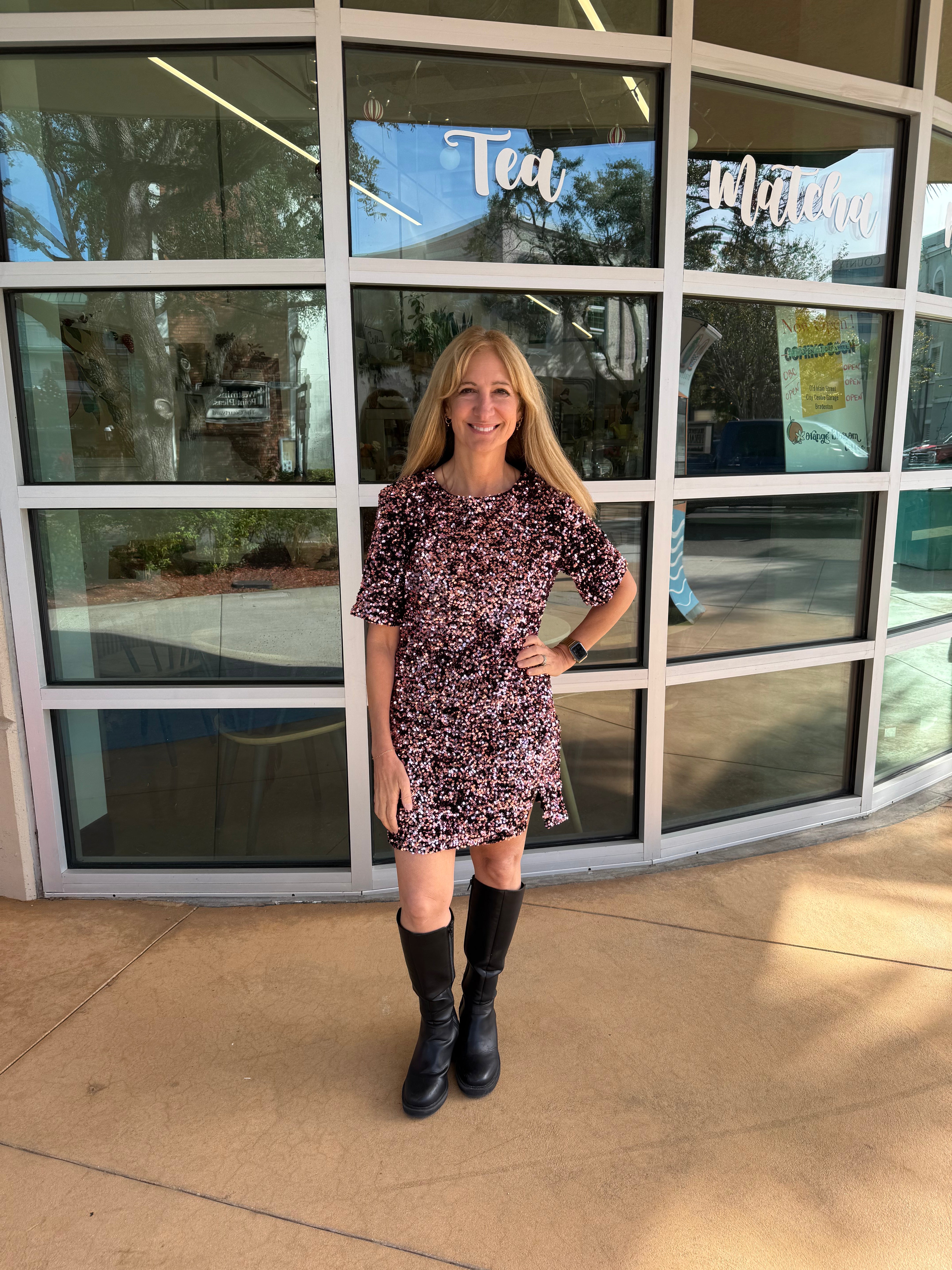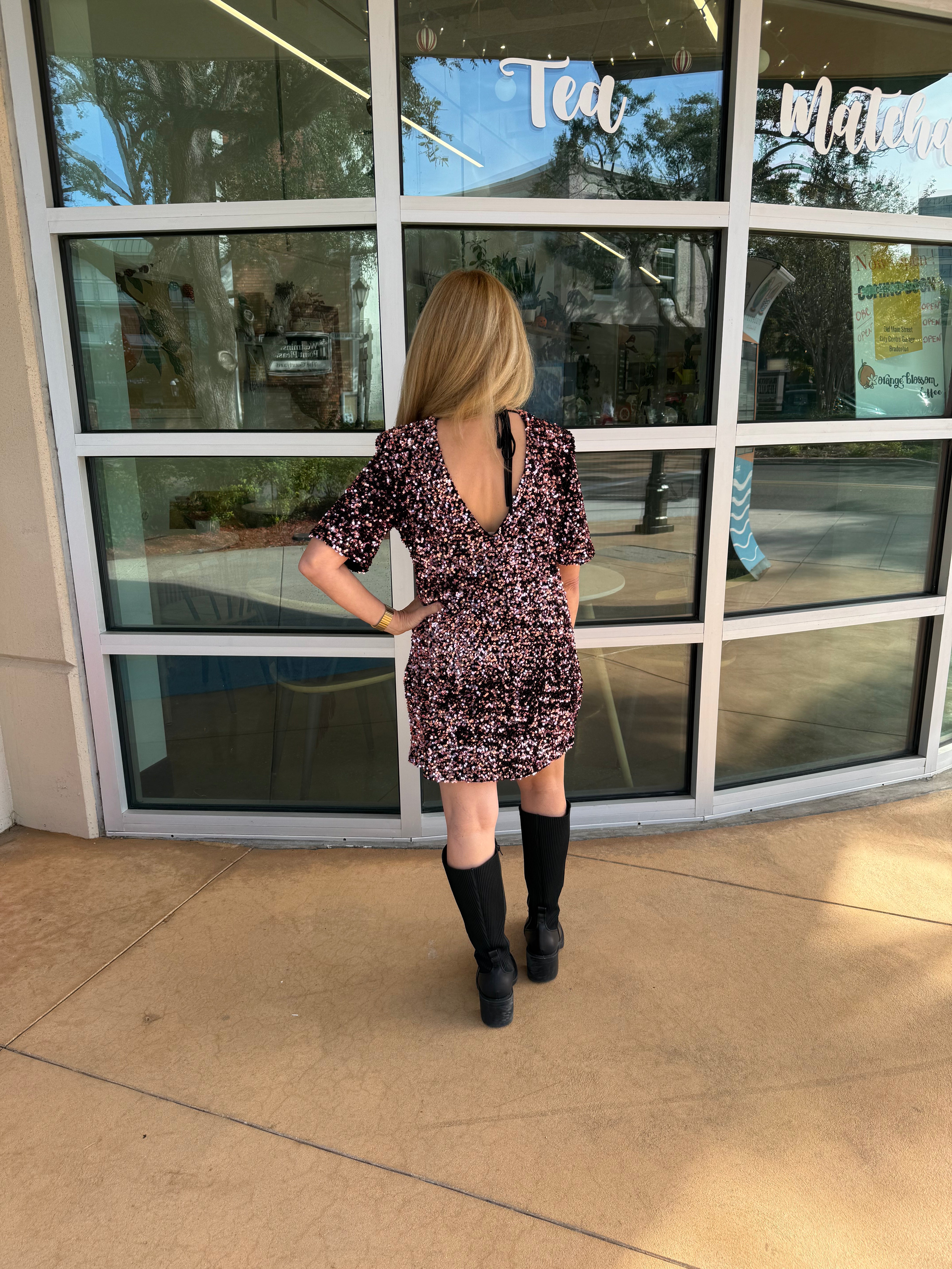 Short Sleeve Sparkle Mini Dress is fun short dress is designed with a sparkling finish, making it a perfect choice for celebratory occasion presented in a lively pink color, the fabric is infused with shimmer for a festive and eye-catching effect.