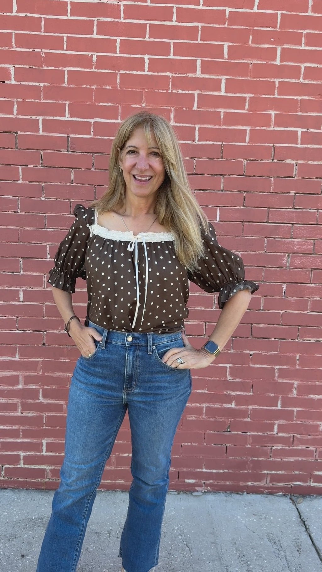 Brown Polka Dot Top with Lace Detail – Pink & Navy Boutique