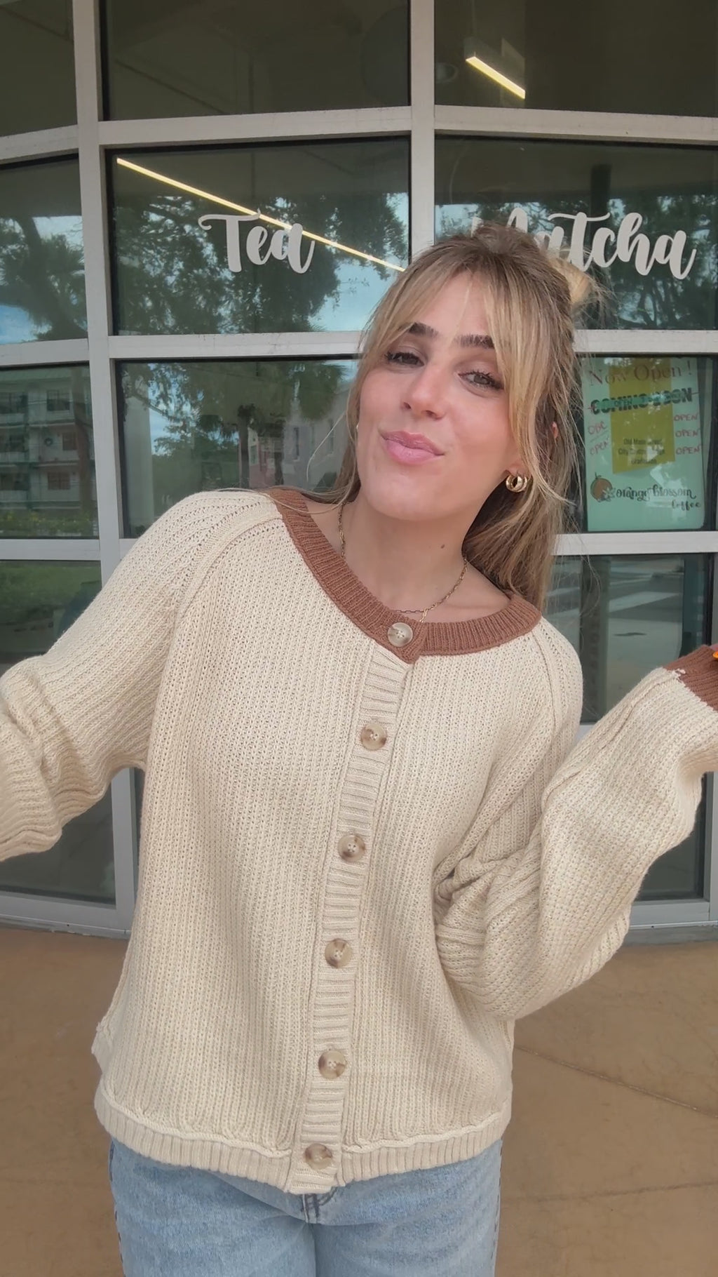This sweater cardigan features a classic round neck and a versatile button-down front, allowing for effortless layering and varied styling options.
